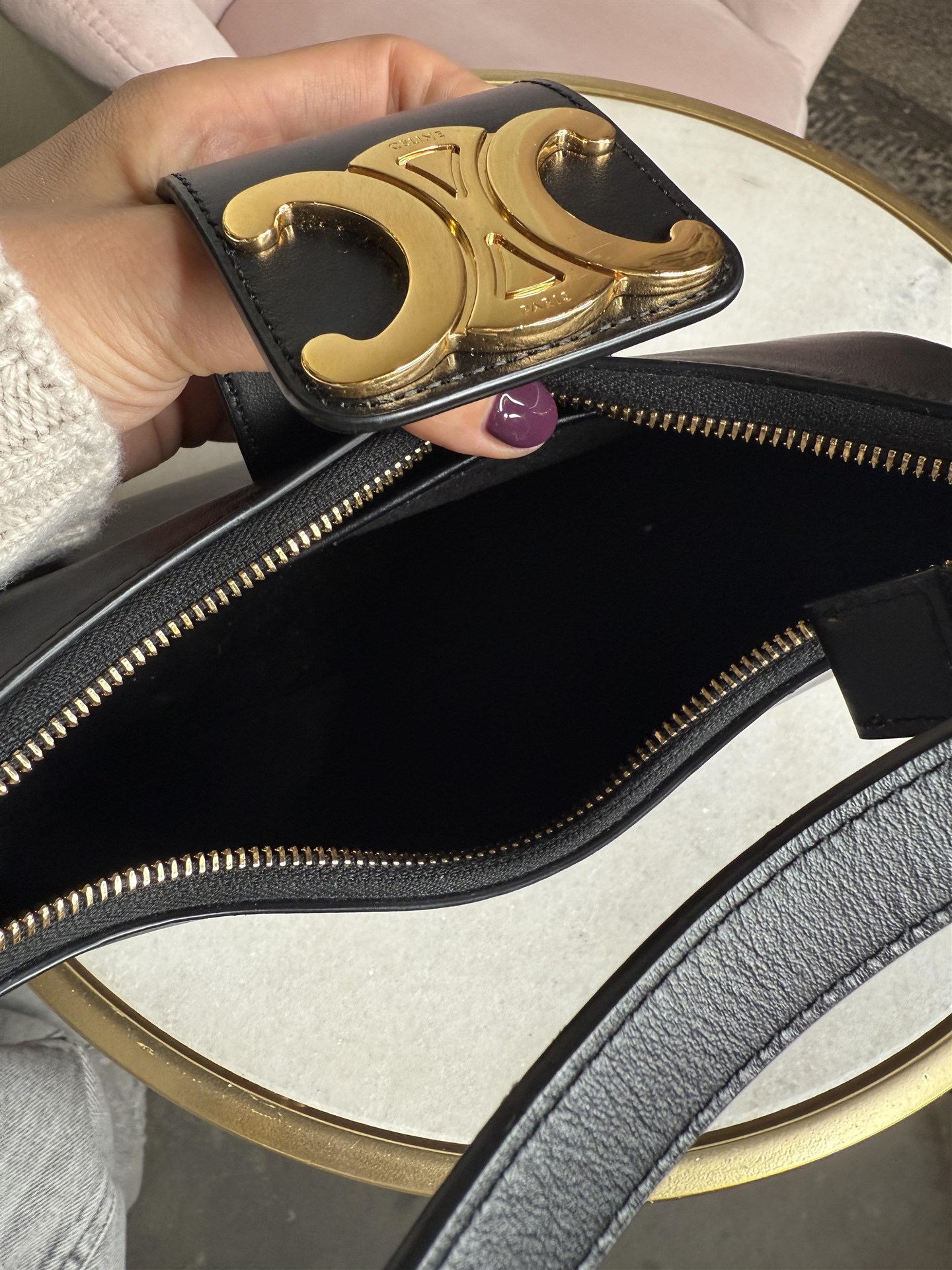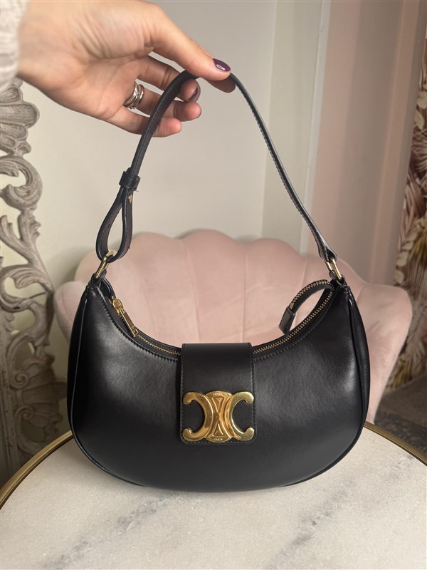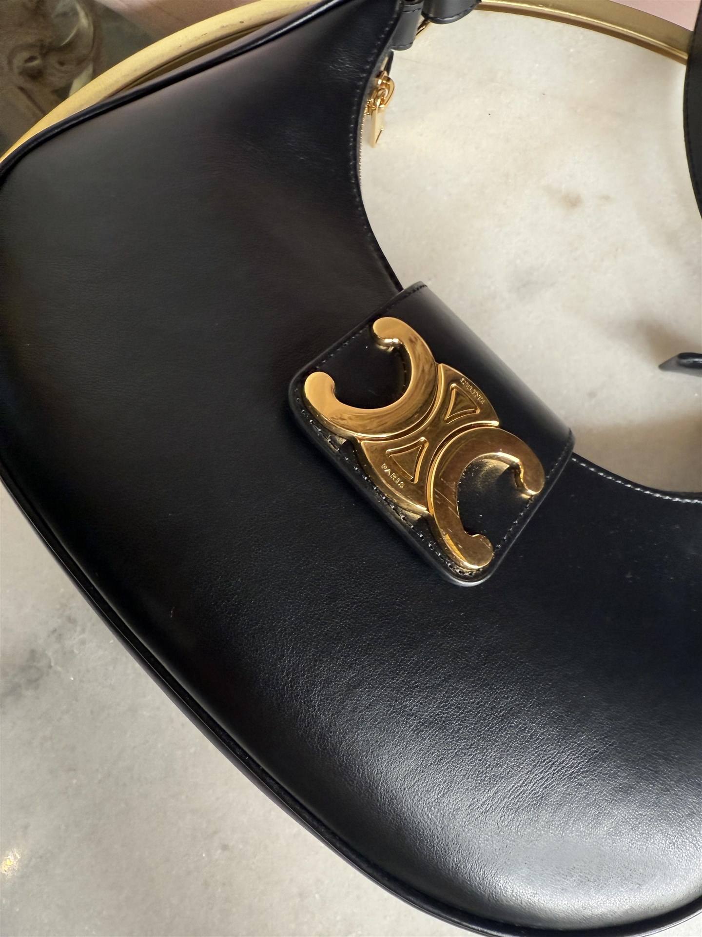 Celine Ava Triomphe, misura media, in pelle liscia color nero con hardware gold. Si presenta in eccellenti condizioni. Si può portare a mano o a spalla. Manico regolabile. Chiusura a cerniera e con patta con bottone a chiusura magnetica. Interno in suède.