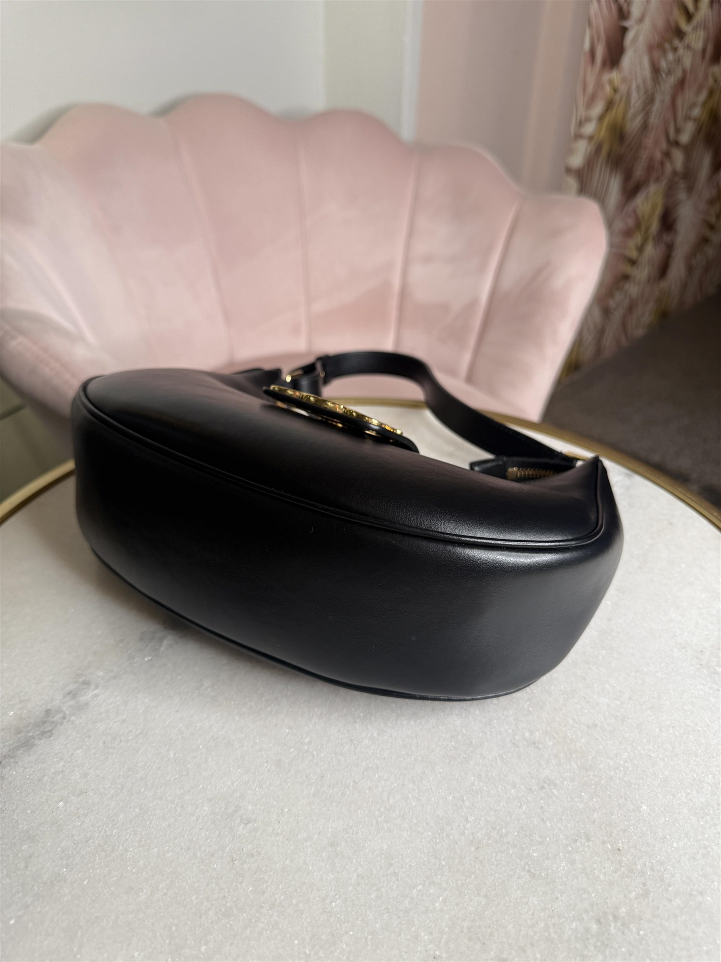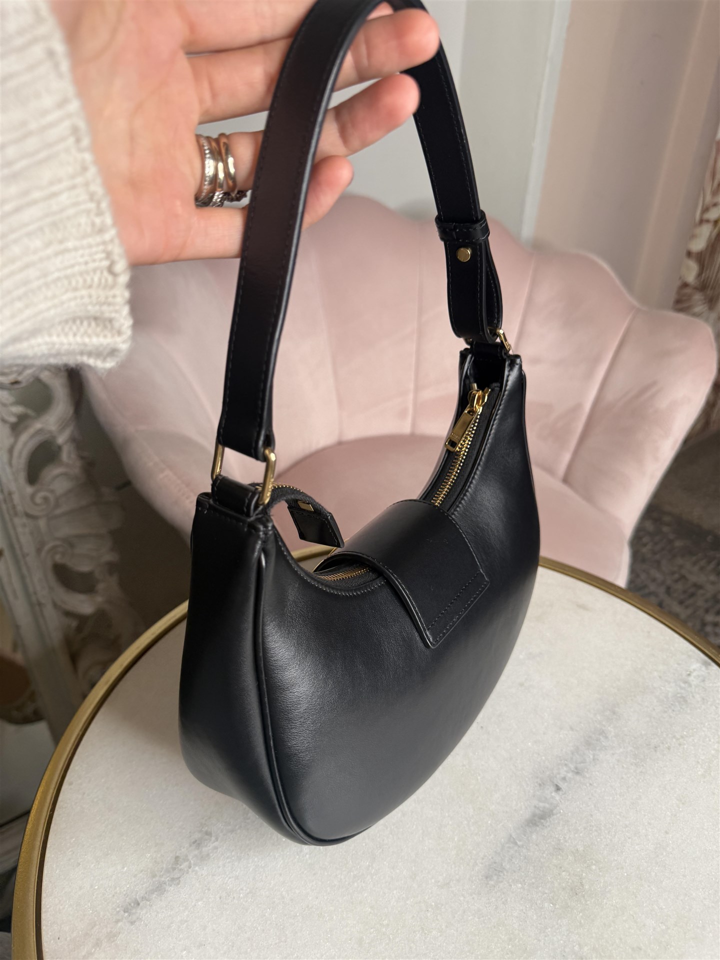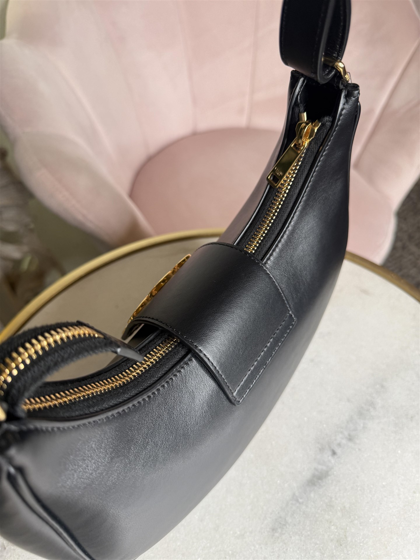 Celine Ava Triomphe, misura media, in pelle liscia color nero con hardware gold. Si presenta in eccellenti condizioni. Si può portare a mano o a spalla. Manico regolabile. Chiusura a cerniera e con patta con bottone a chiusura magnetica. Interno in suède.