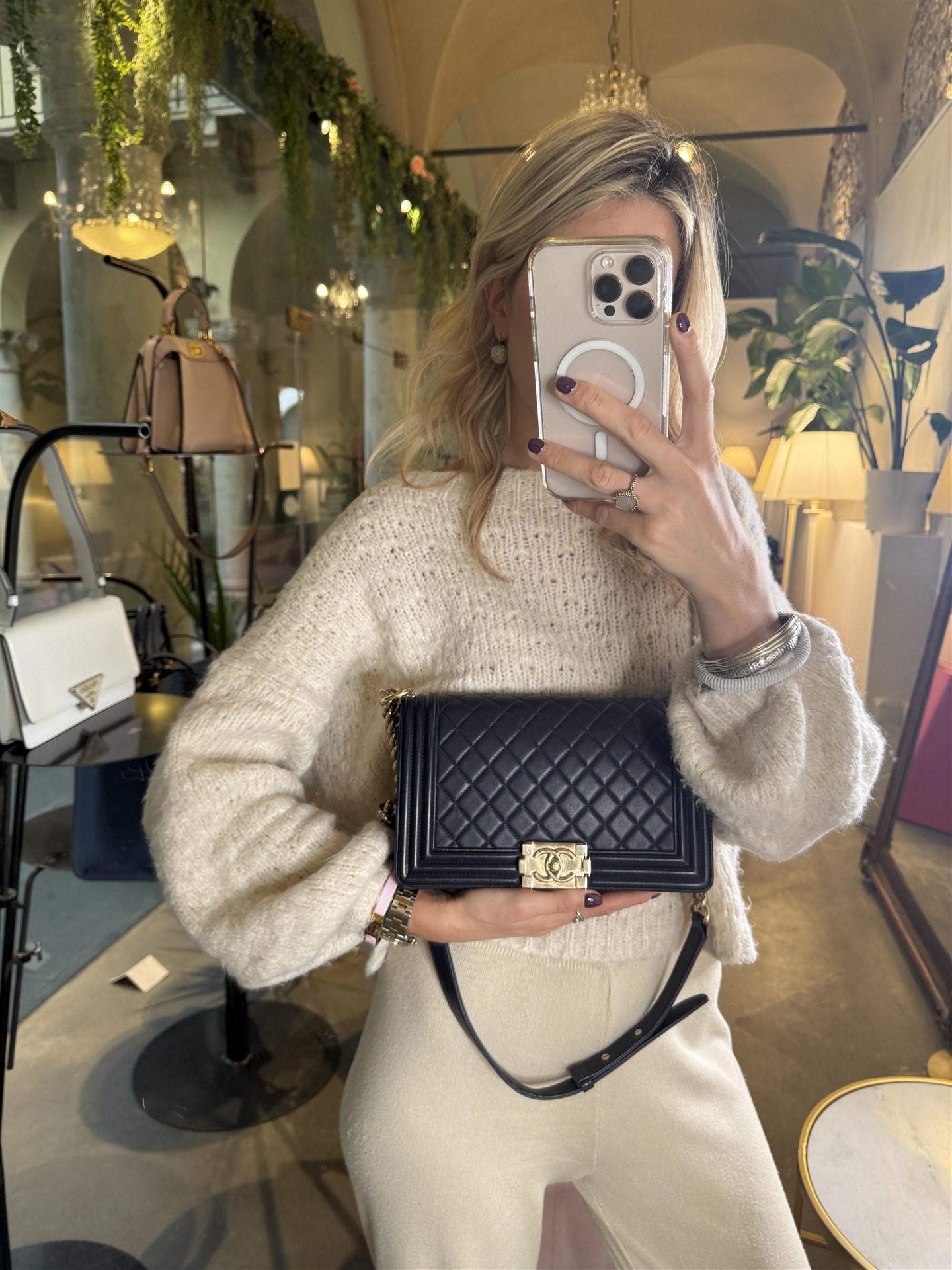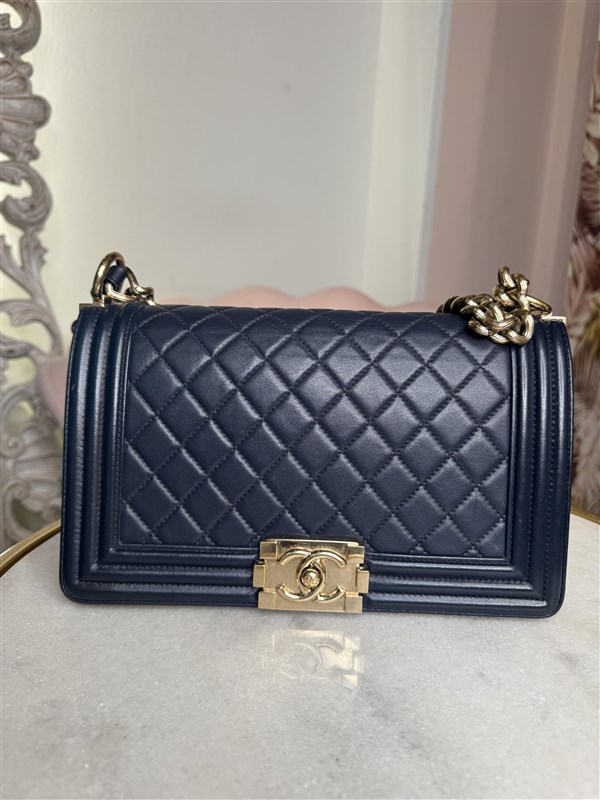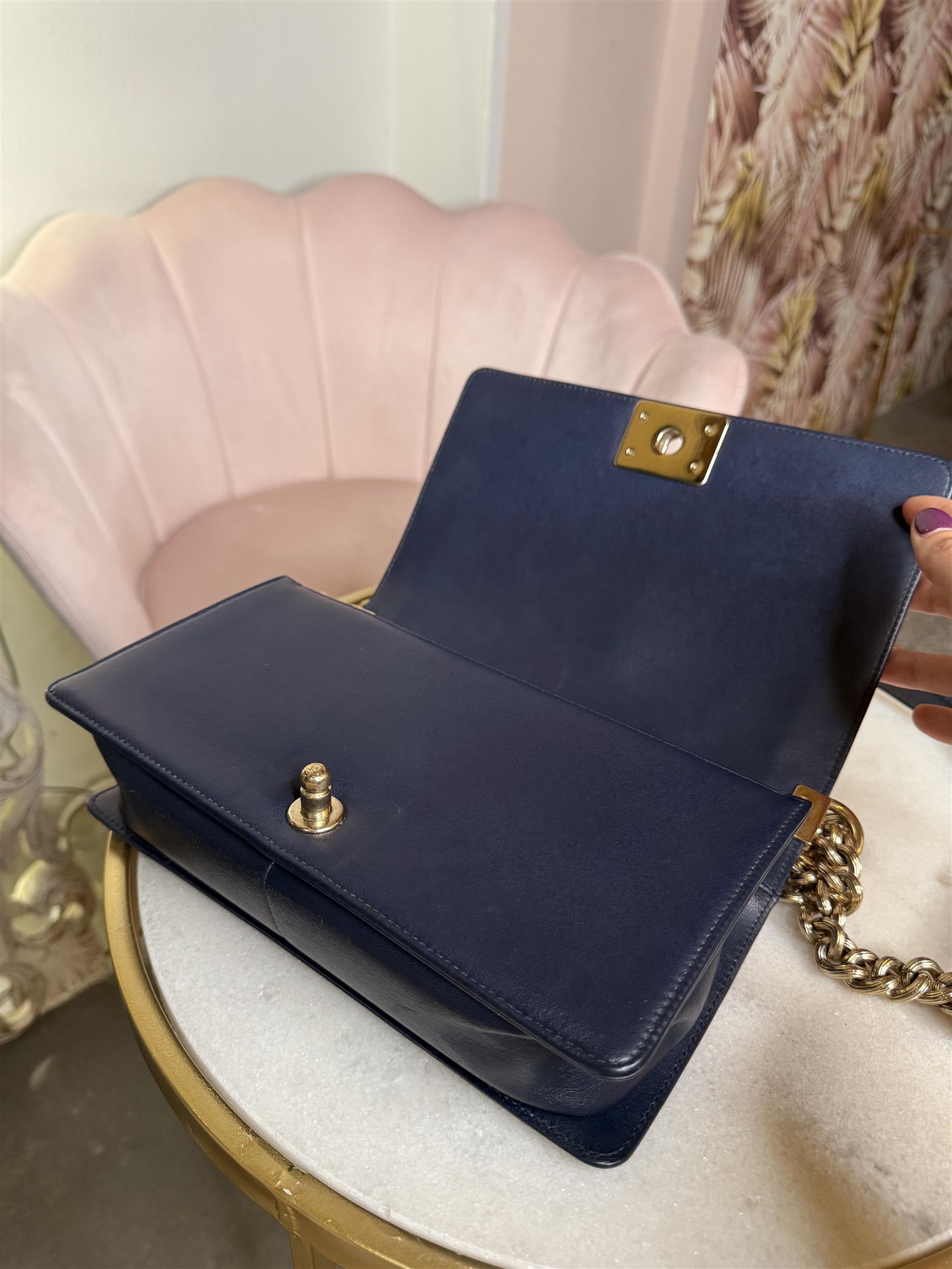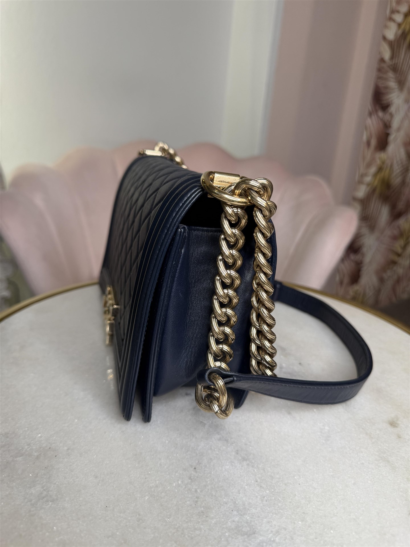 Chanel Boy misura media in pelle matelassé color blu notte con hardware gold. Si presenta in eccellenti condizioni.
