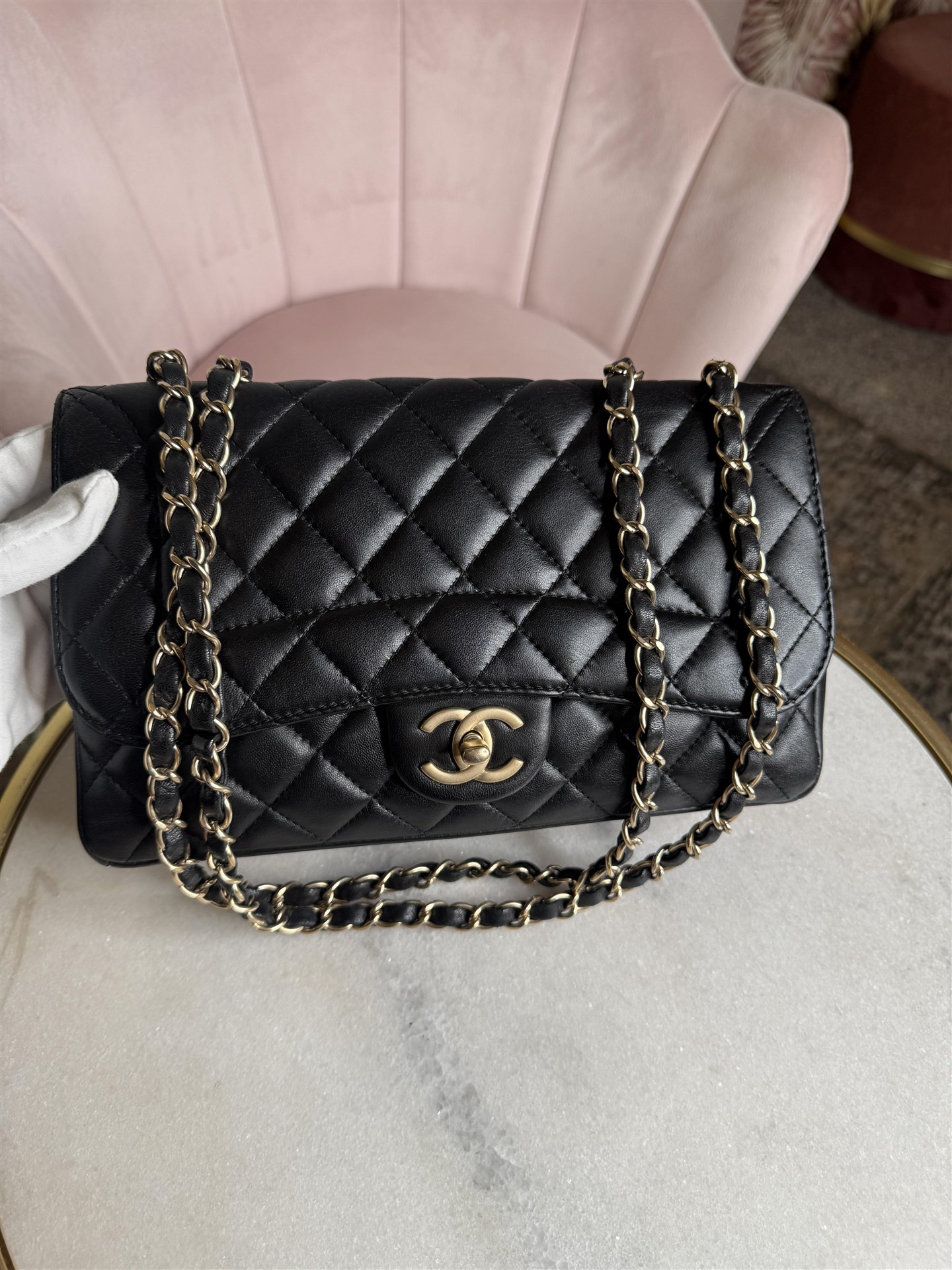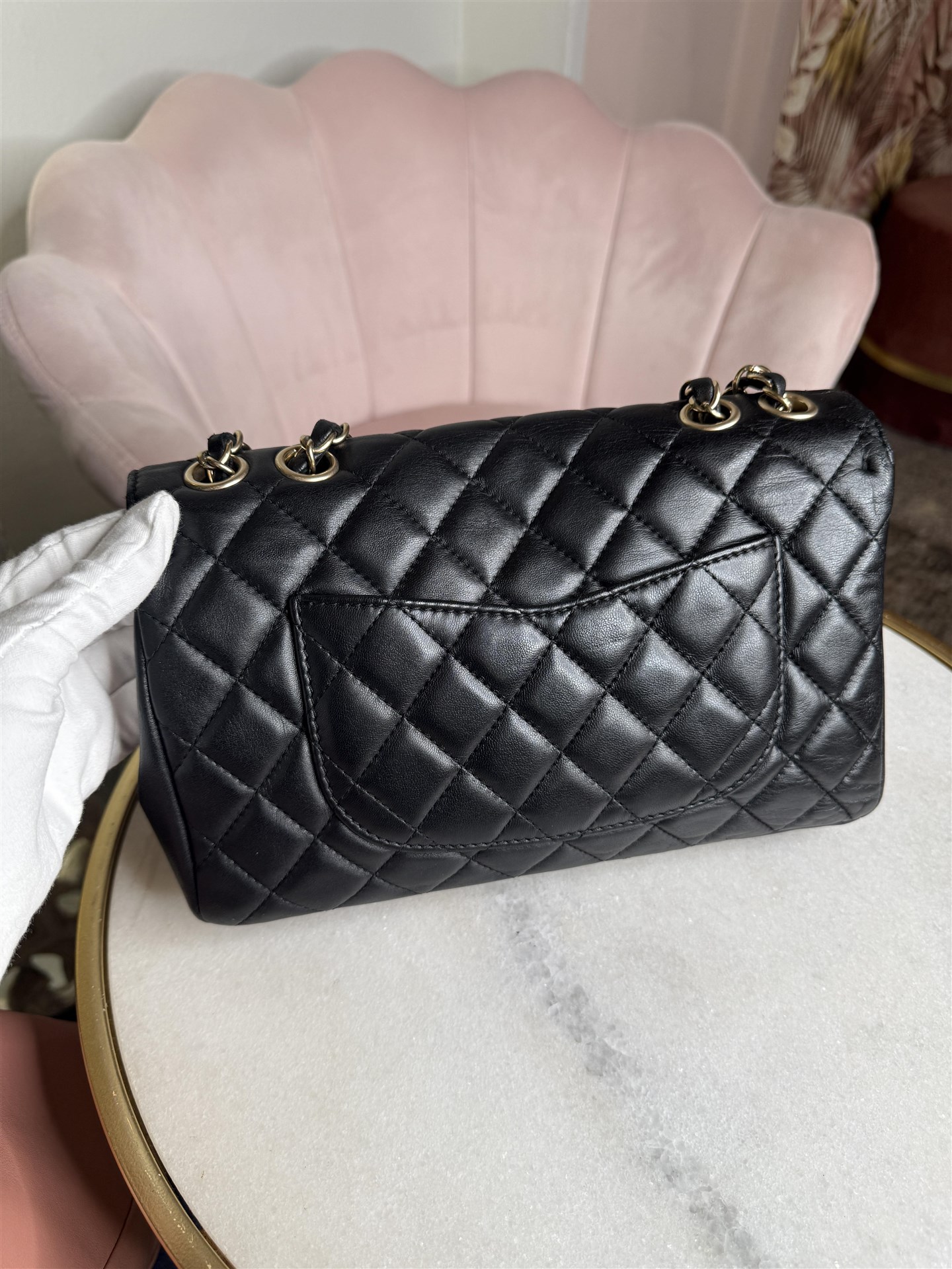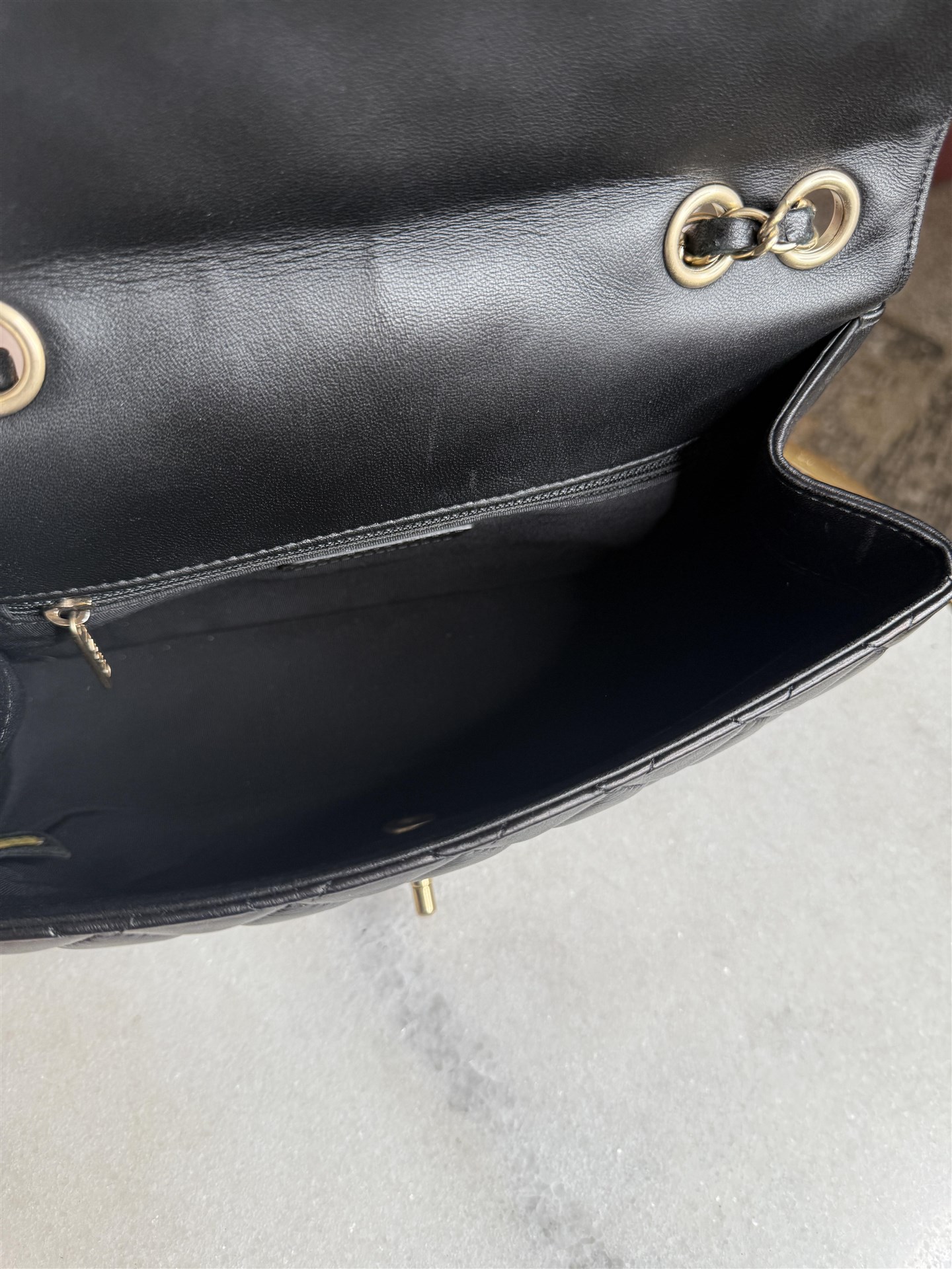 Chanel Single Flap in pelle liscia color nero con hardware gold satinato. Si presenta in ottime condizioni. Tracolla a catena e pelle. Interno in tessuto. Si può portare a spalla o a tracolla.