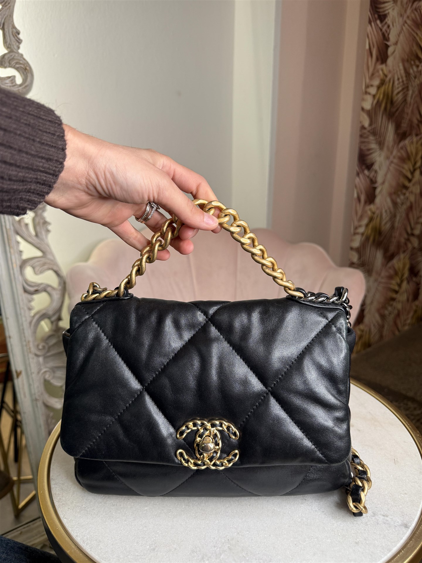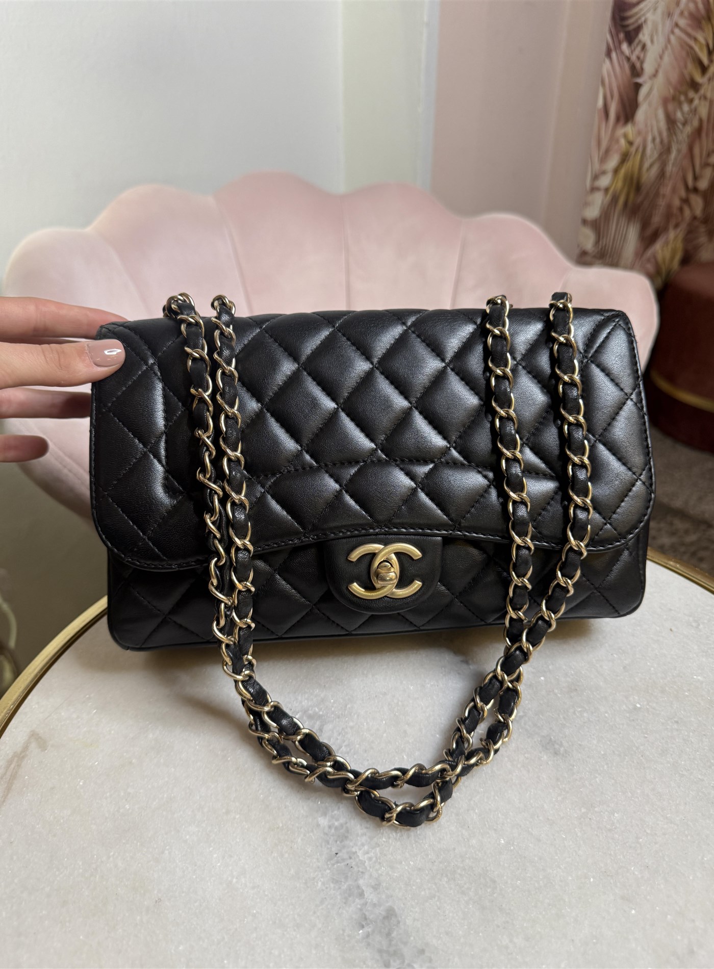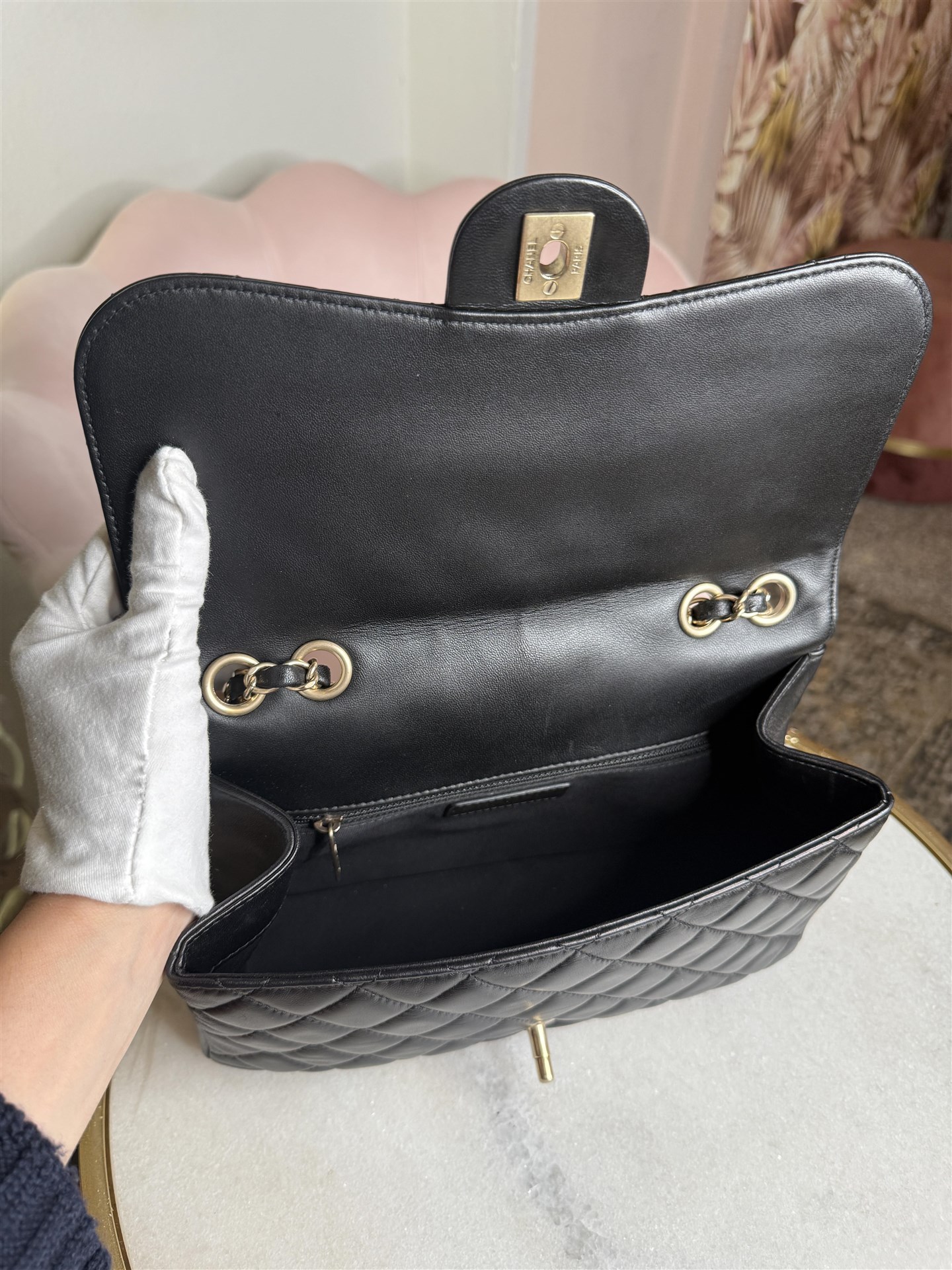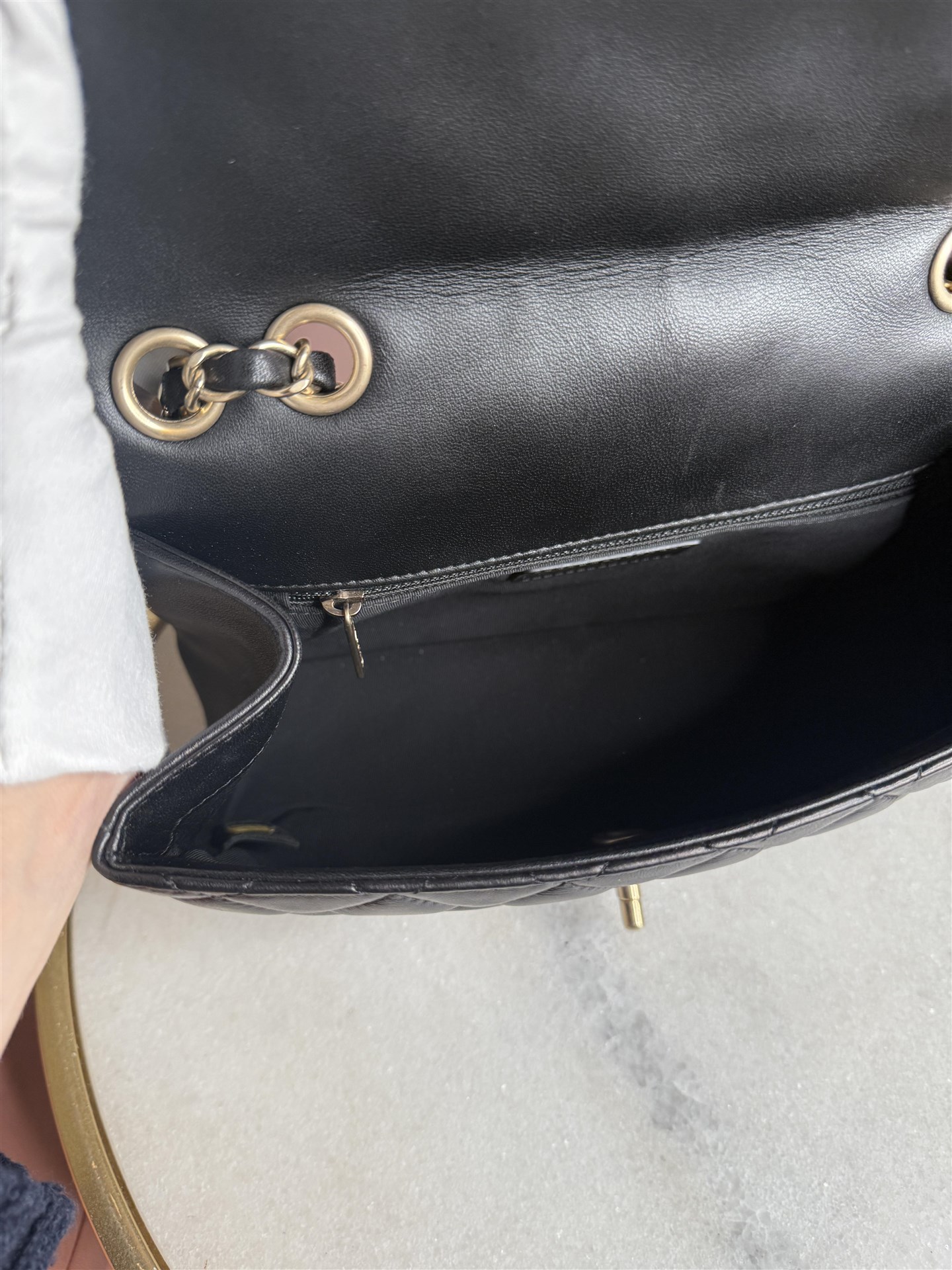 Chanel Single Flap in pelle liscia color nero con hardware gold satinato. Si presenta in ottime condizioni. Tracolla a catena e pelle. Interno in tessuto. Si può portare a spalla o a tracolla.