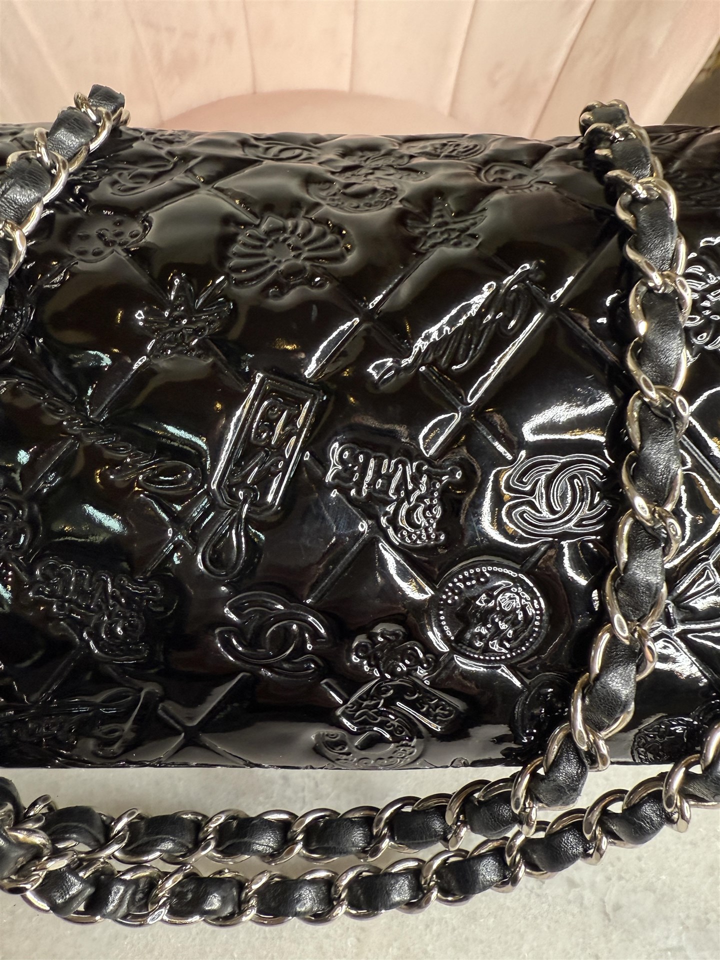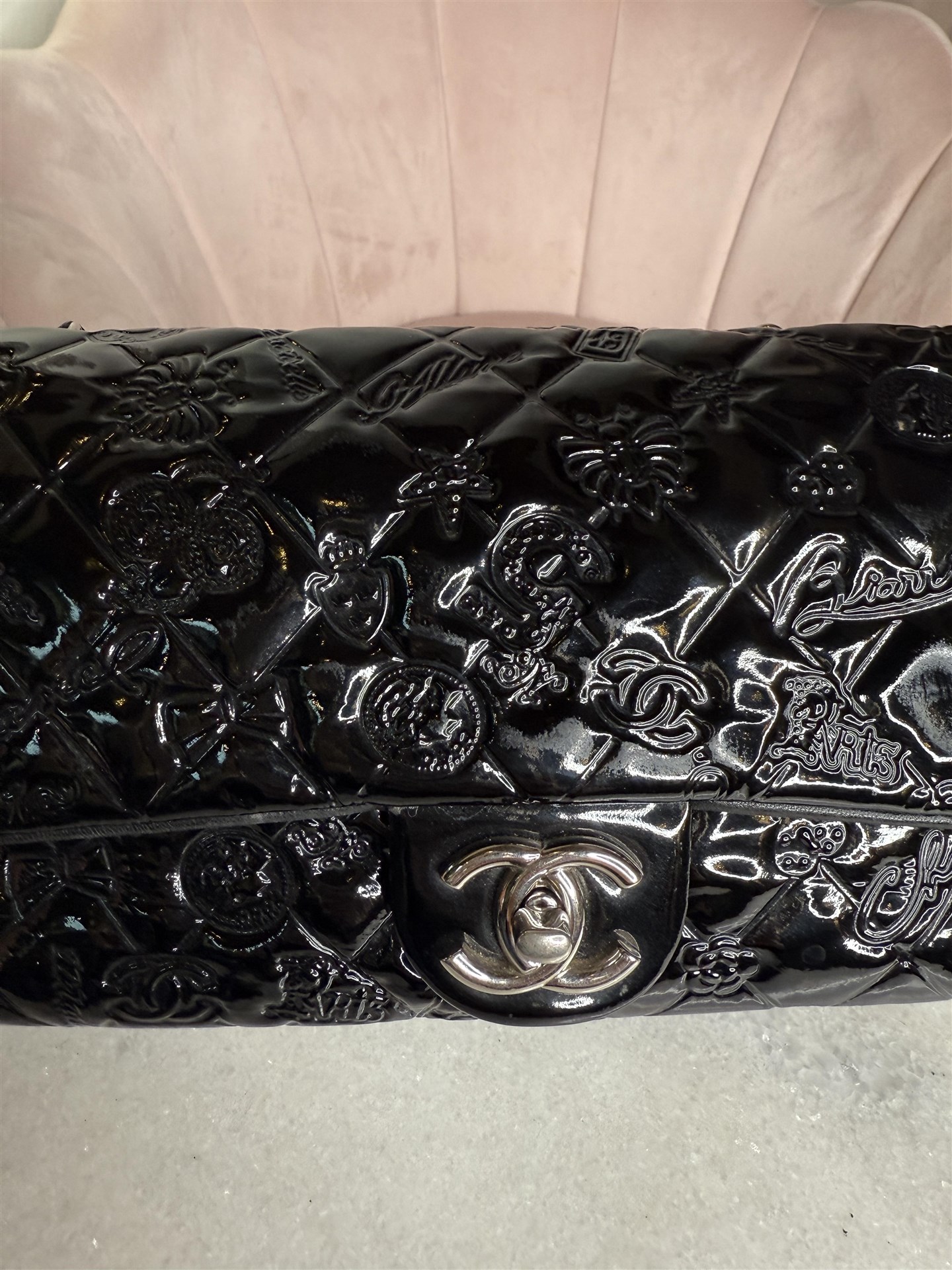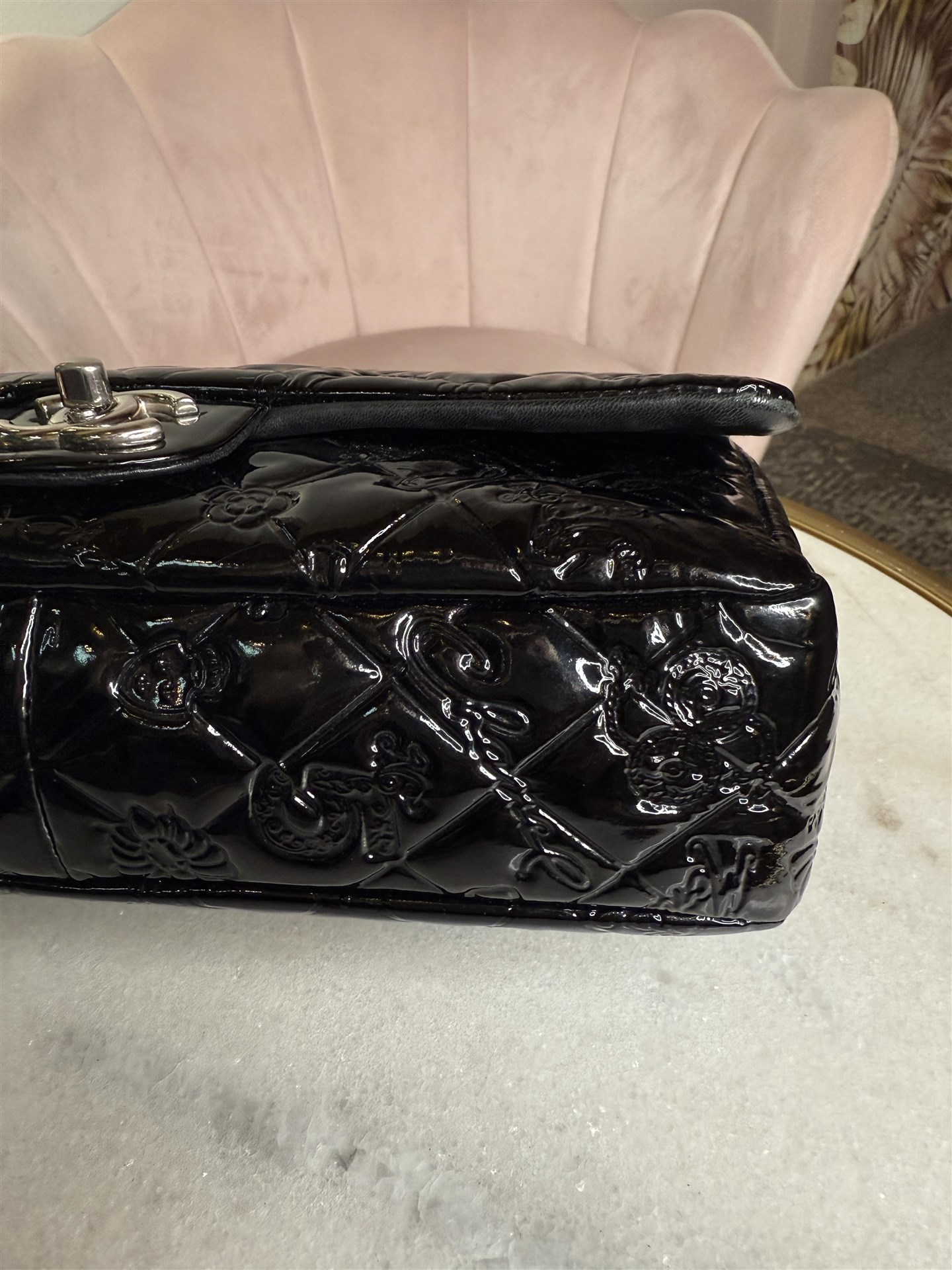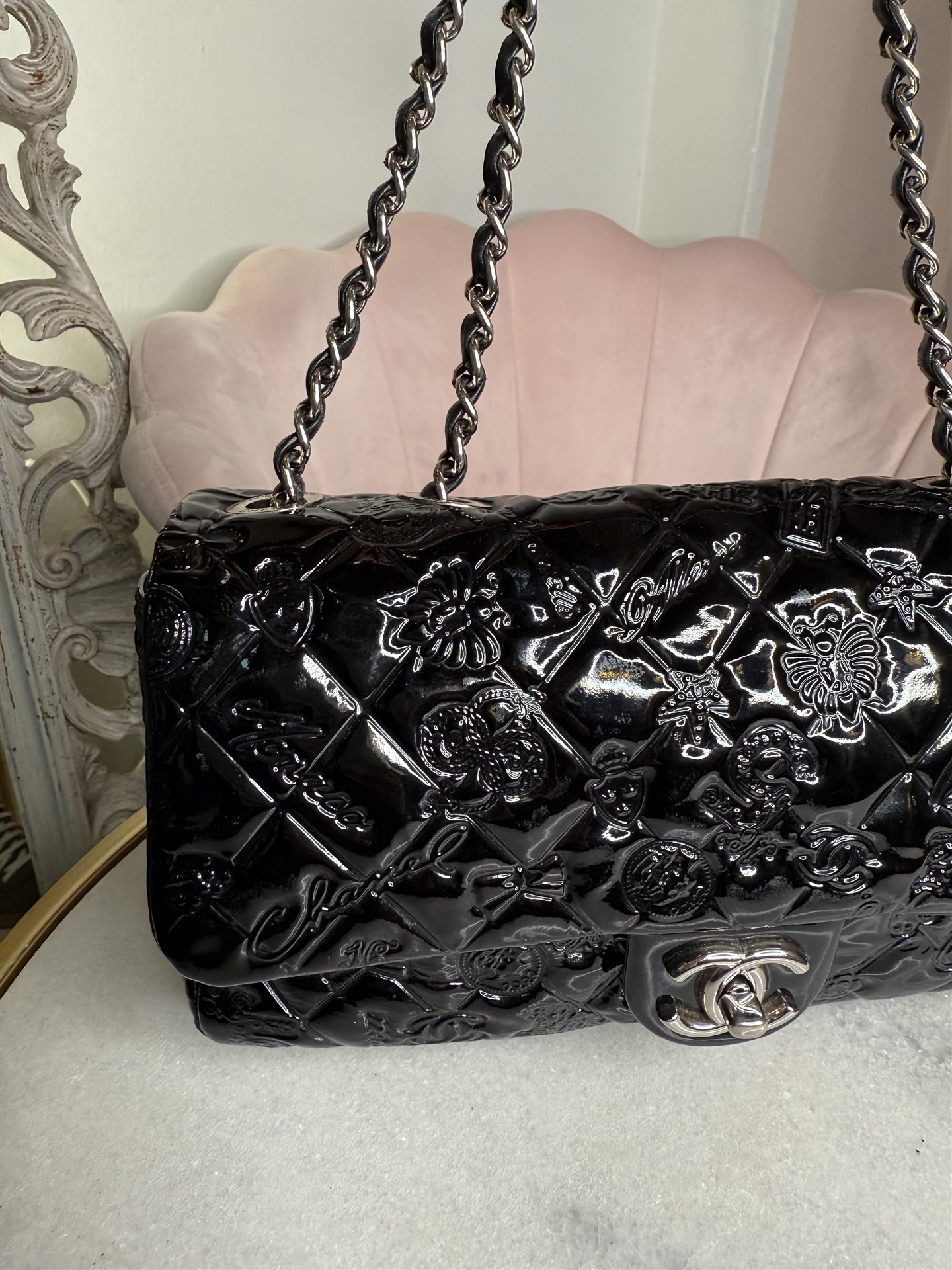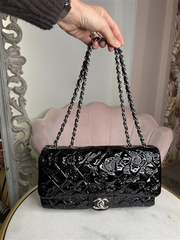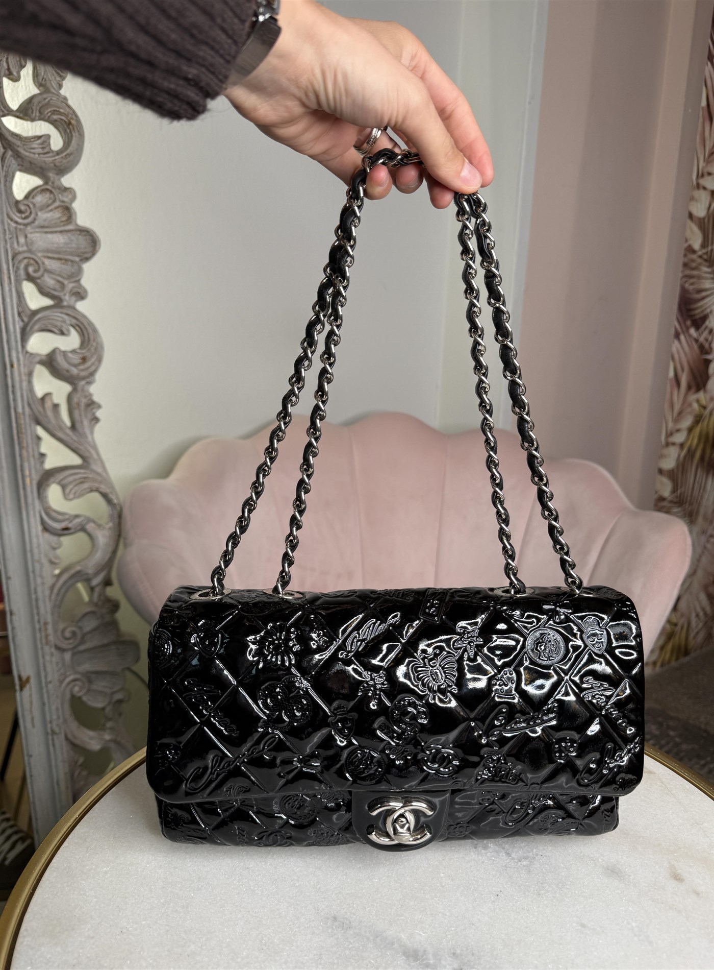 Chanel Single Flap, edizione limitata, in vernice color nero matelassé con impressi loghi decoro (simboli portafortuna). Hardware silver. Si presenta in buone condizioni con qualche segno di usura all'esterno. Interno, in raso color borgogna, in condizioni eccellenti. Si può portare a spalla o a tracolla.
