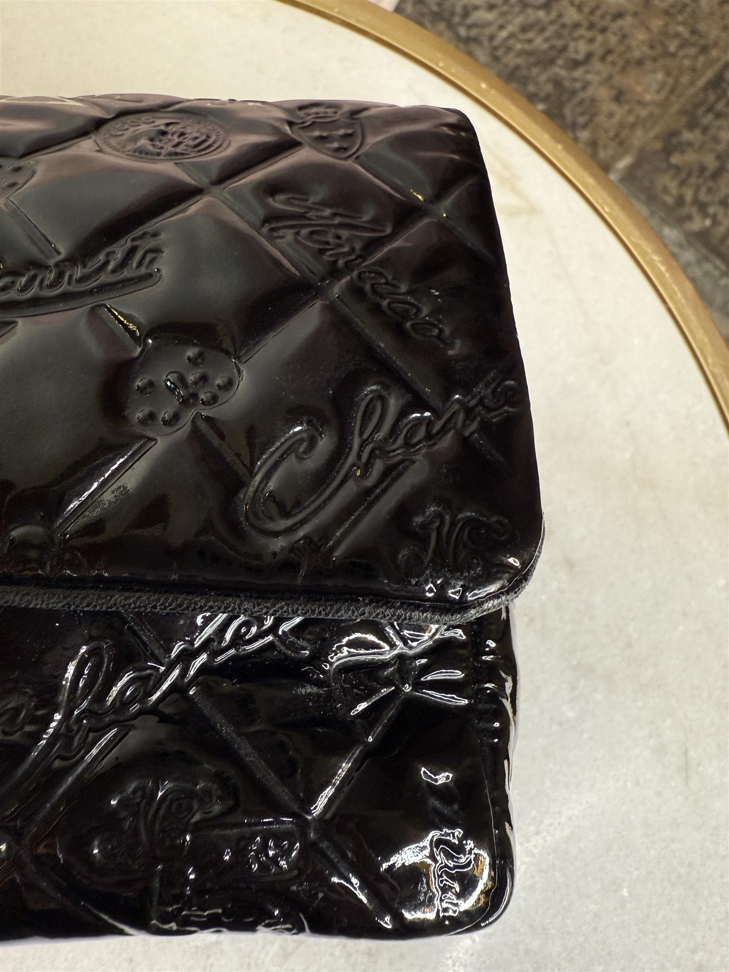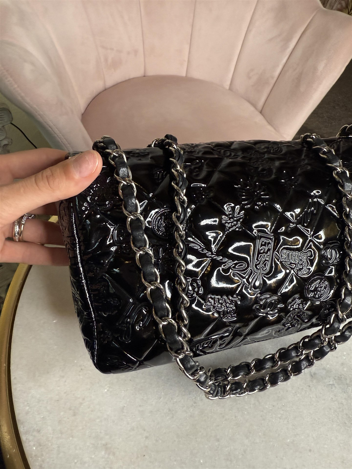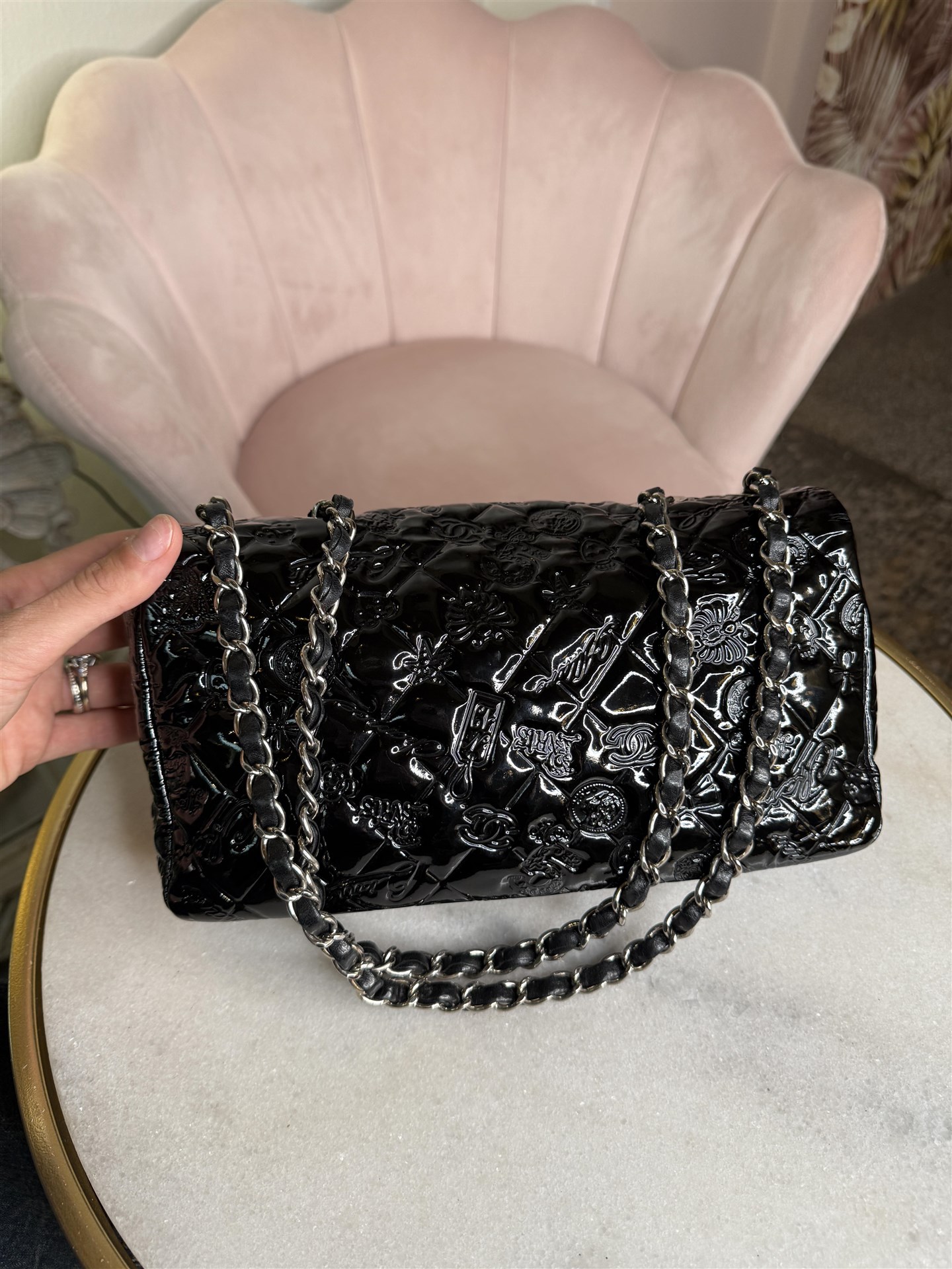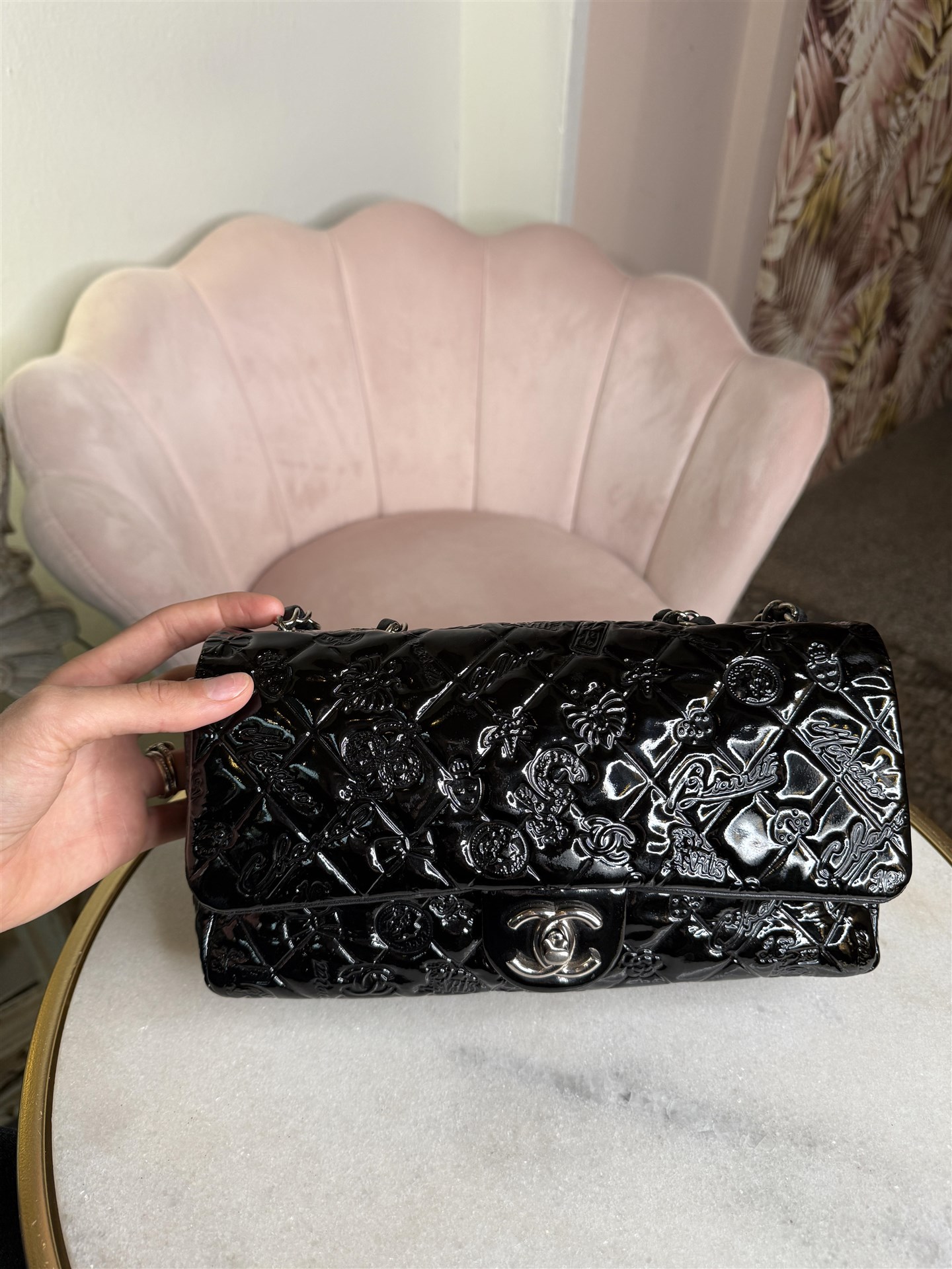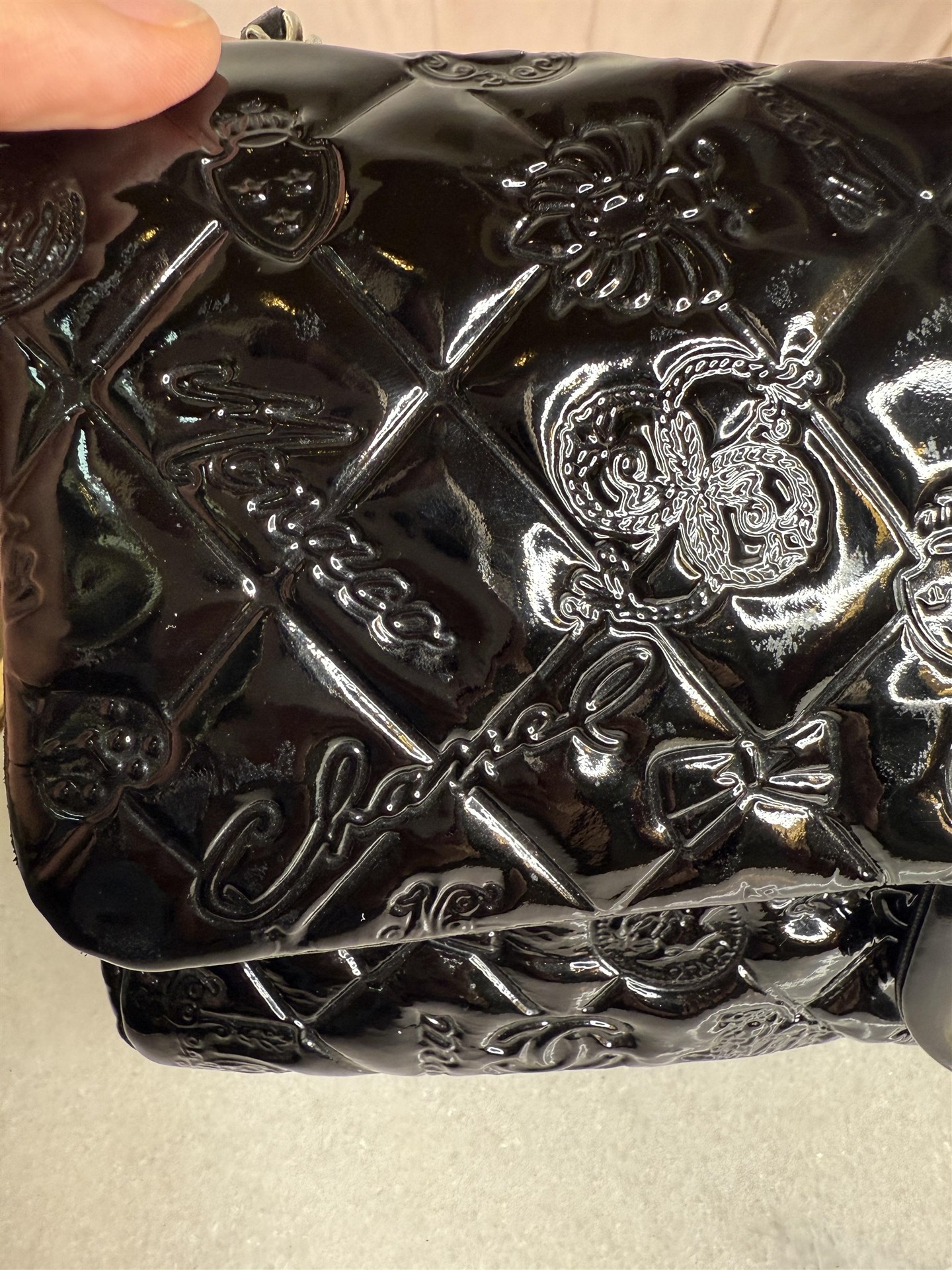 Chanel Single Flap, edizione limitata, in vernice color nero matelassé con impressi loghi decoro (simboli portafortuna). Hardware silver. Si presenta in buone condizioni con qualche segno di usura all'esterno. Interno, in raso color borgogna, in condizioni eccellenti. Si può portare a spalla o a tracolla.