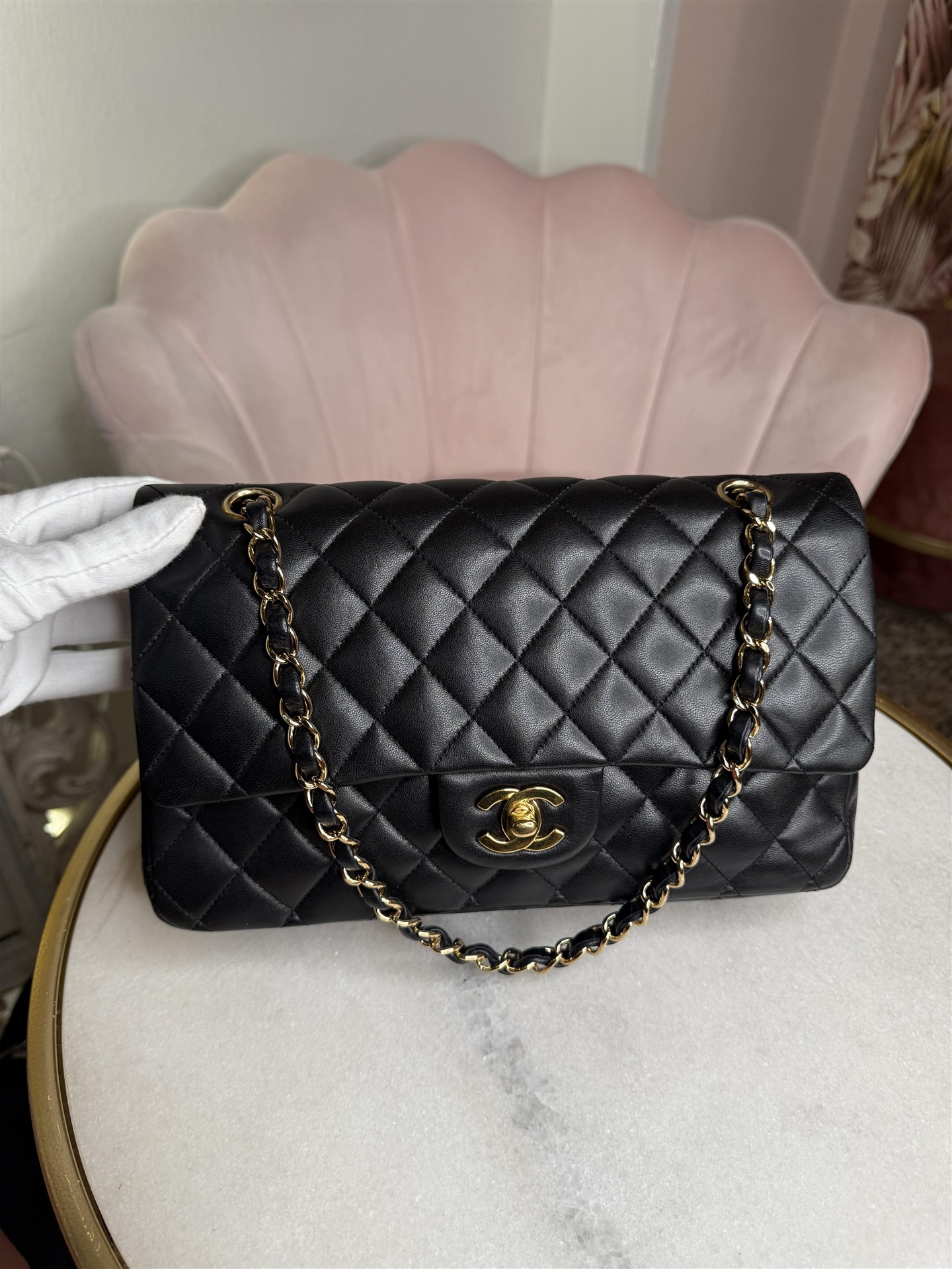 Chanel Timeless misura media in pelle di agnello color rosa con hardware silver. Si presenta in buone condizioni con qualche segno di utilizzo e lievi scoloriture sulla pelle. Doppia patta e interno in pelle rosa.