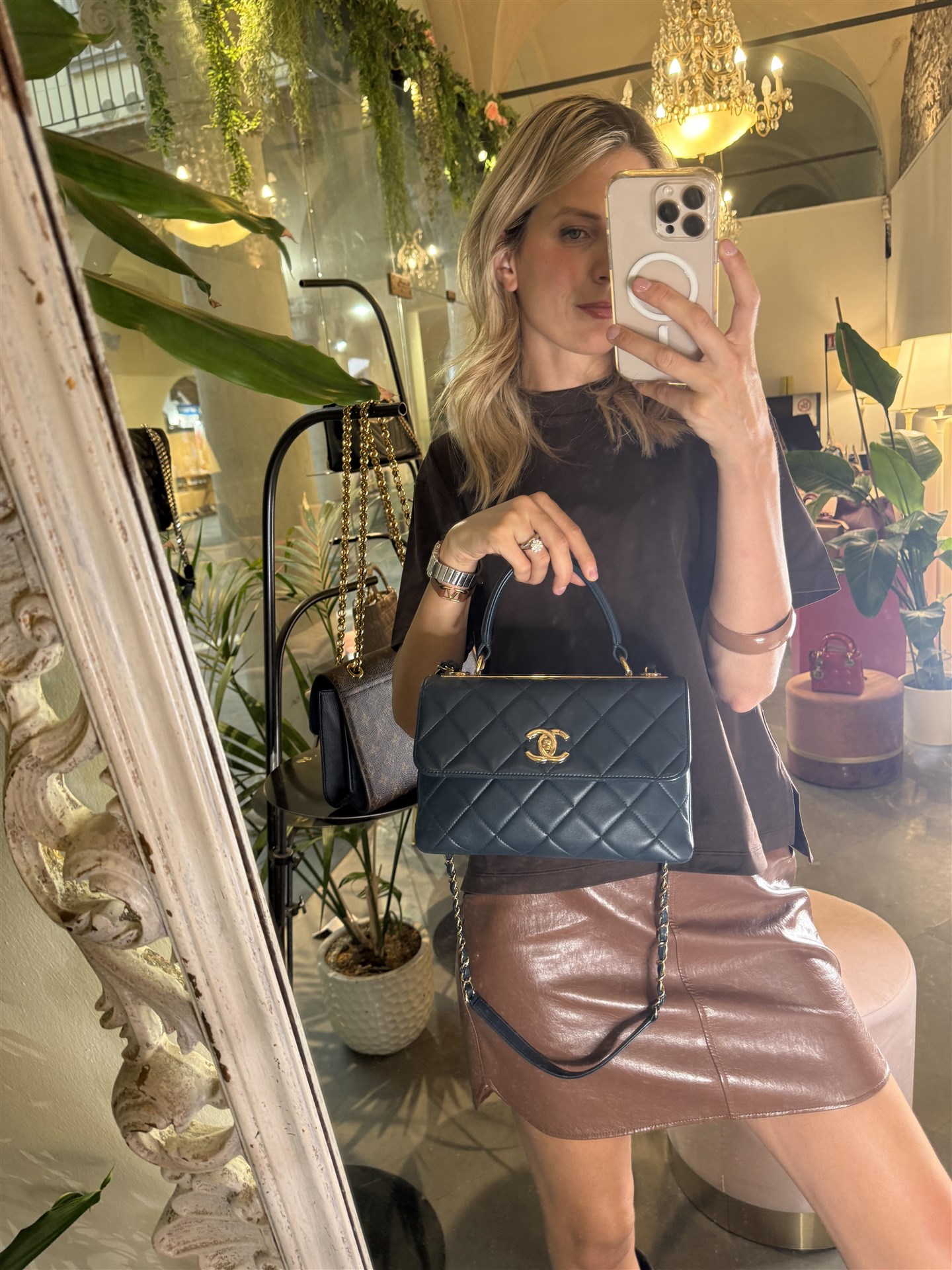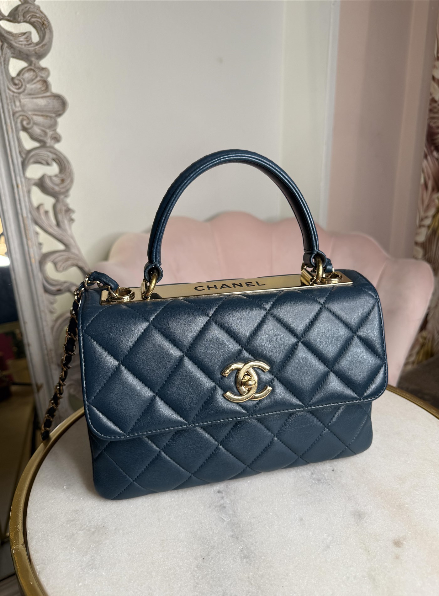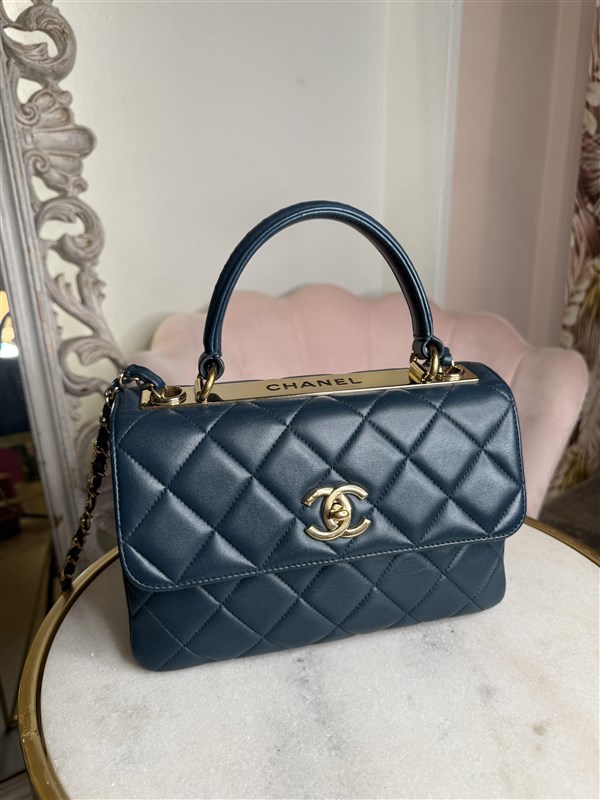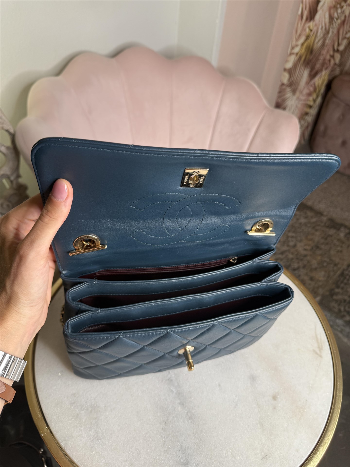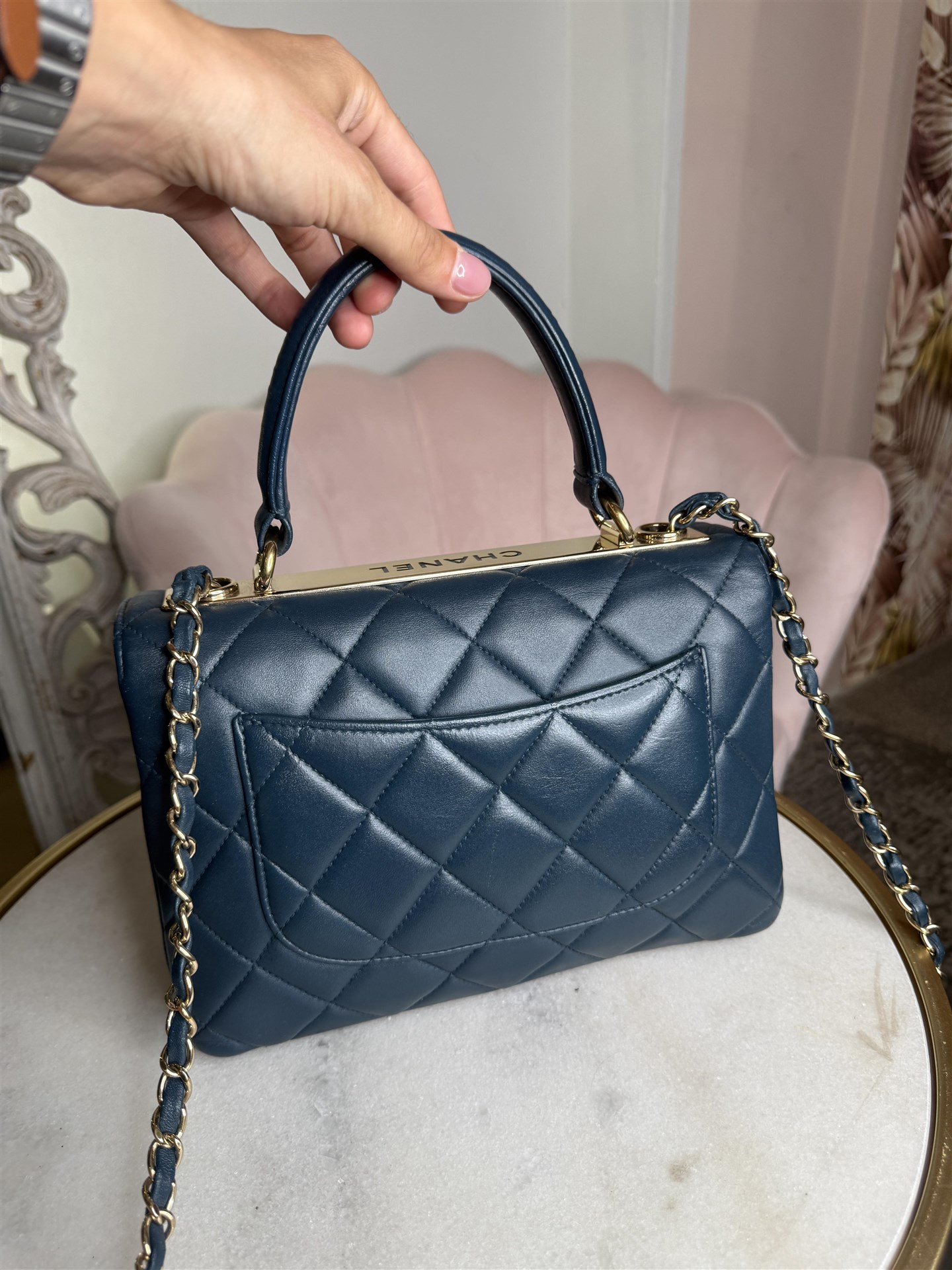 Descrizione: Chanel Trendy misura media in pelle liscia color blu con hardware gold. Si presenta in eccellenti condizioni. E' dotata di tre scomparti interni. Manico in pelle e tracolla removibile a catena con inserto in pelle.
