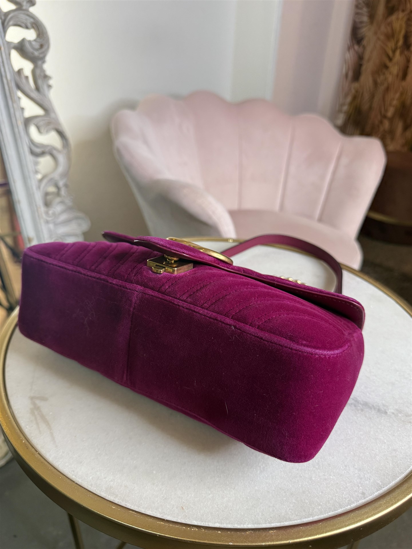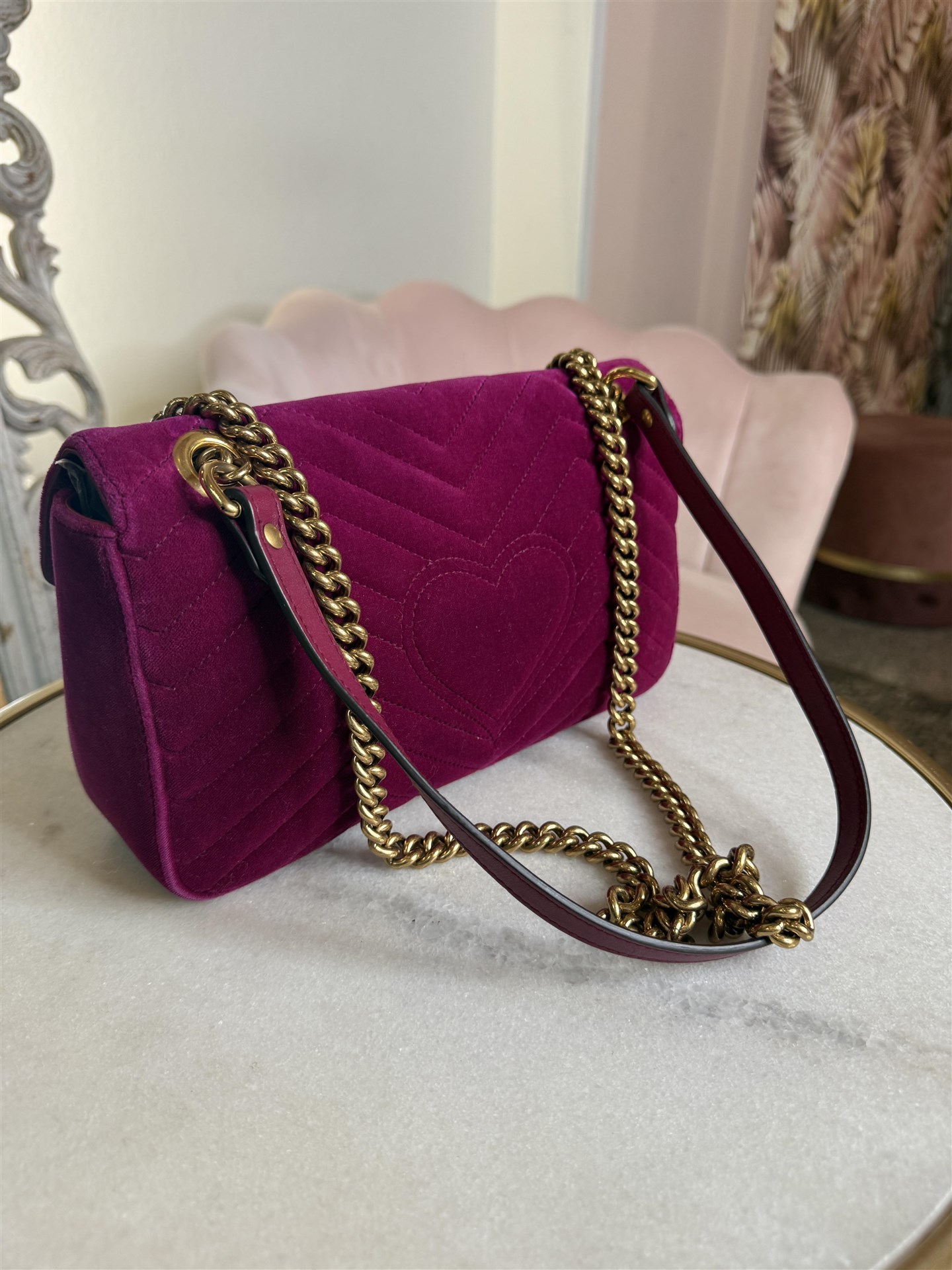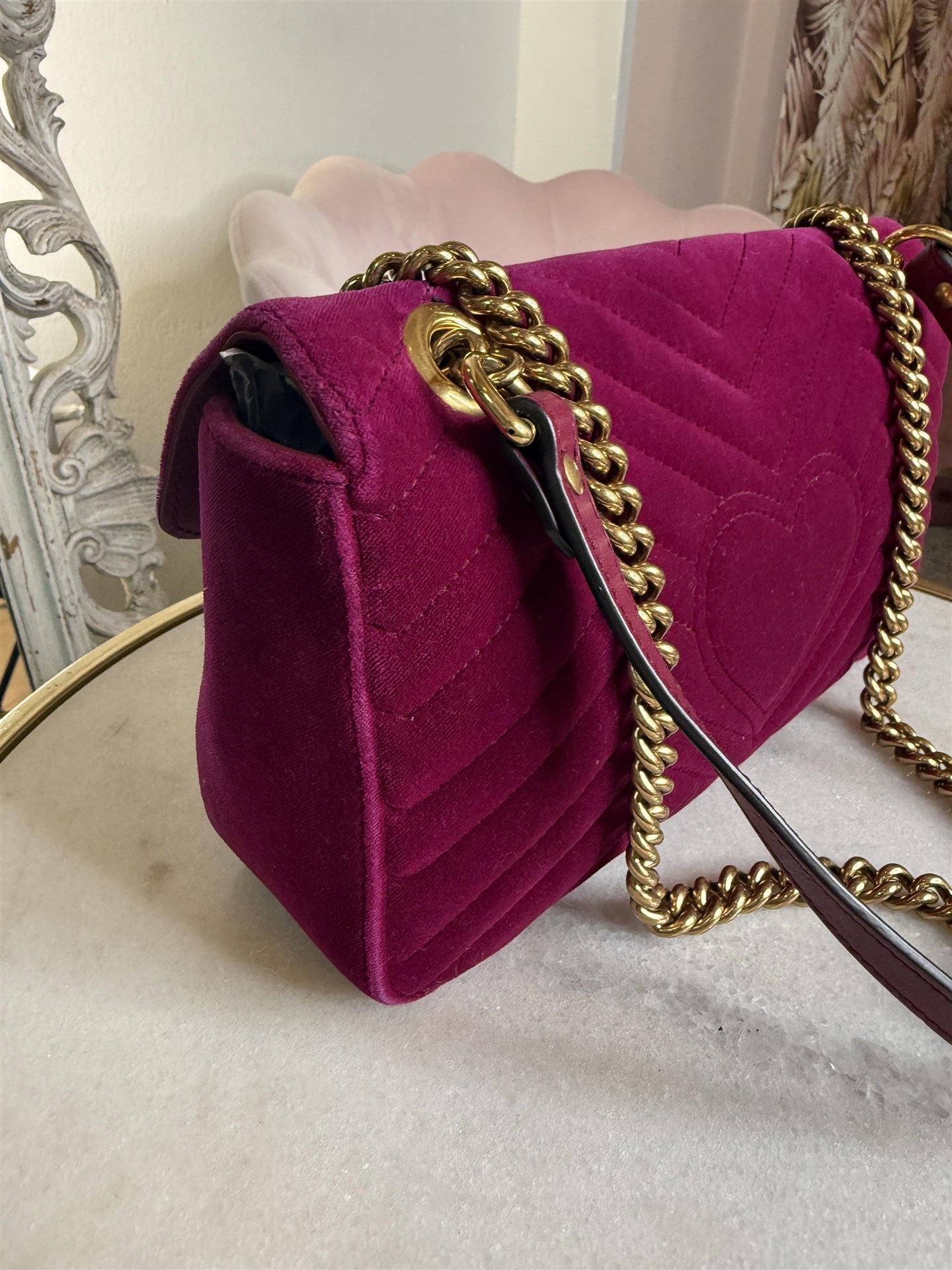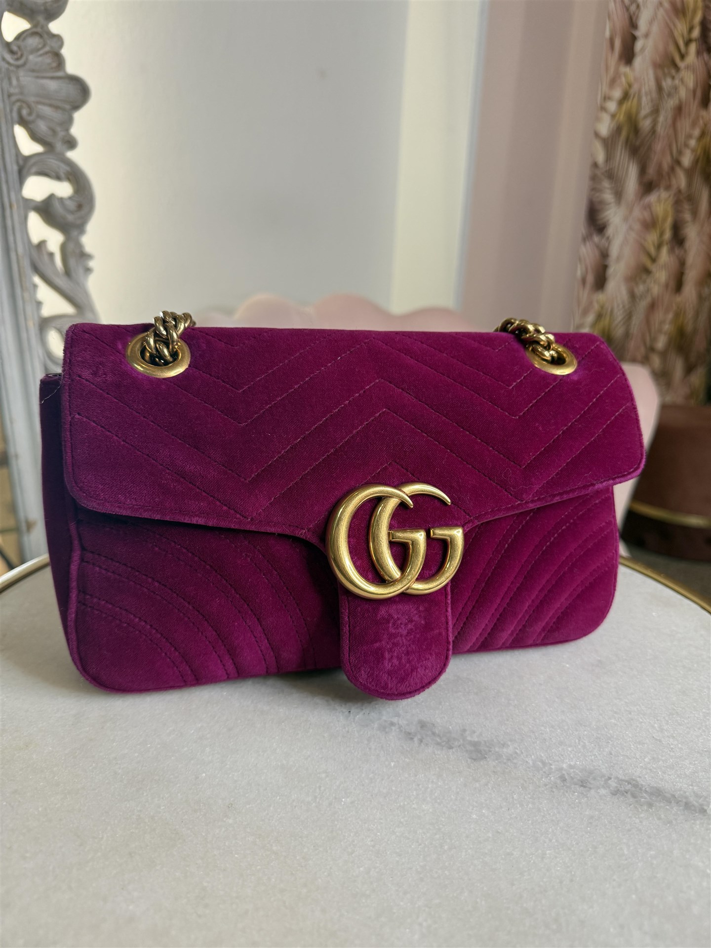 Gucci Marmont misura media in velluto color amaranto con hardware gold. Si presenta in ottime condizioni con qualche segno di utilizzo. Tracolla a catena e pelle.
