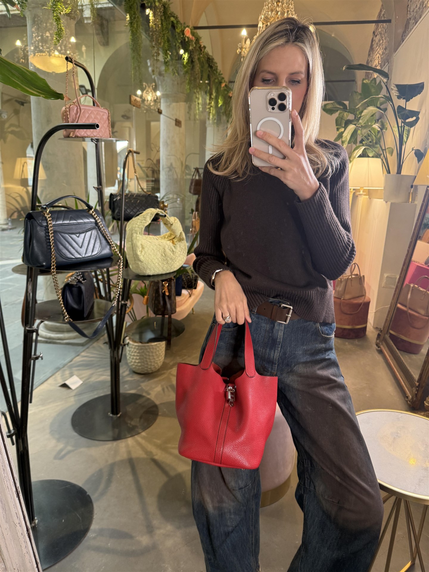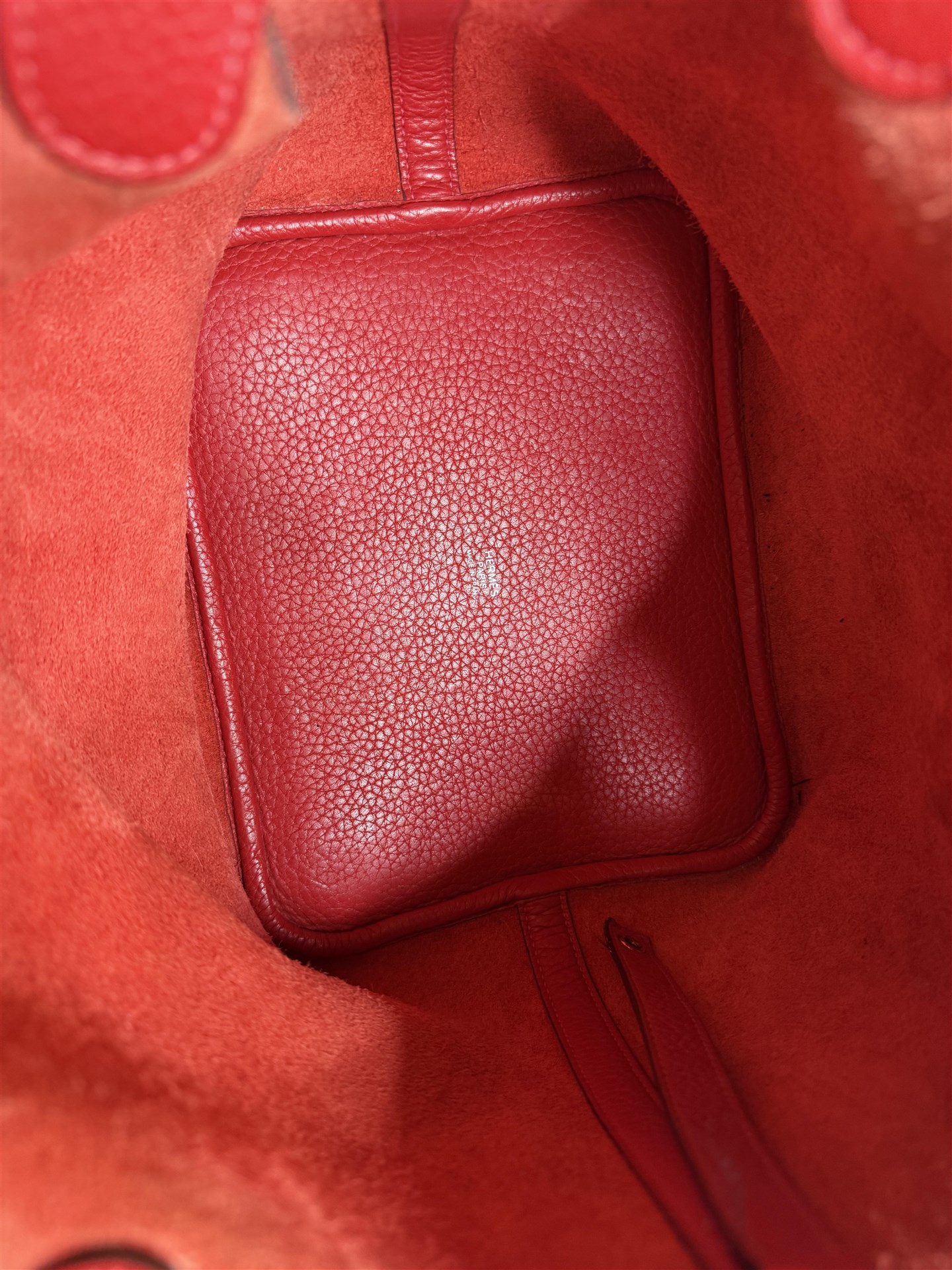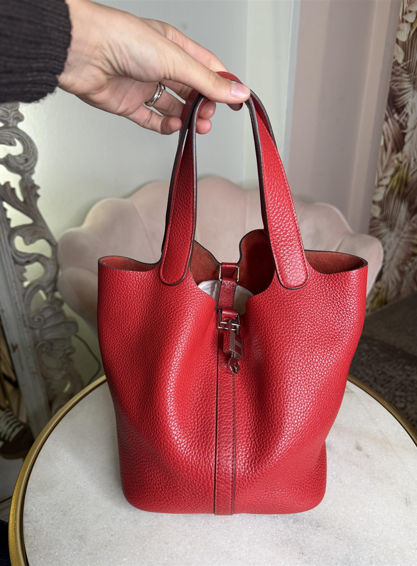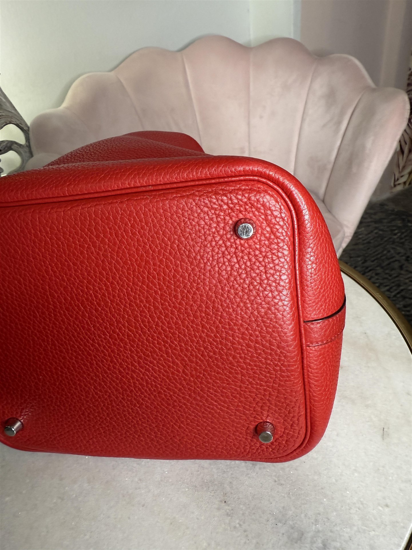 Hermès Picotin misura 22 cm in pelle Clemence color rosso con hardware palladio. Si presenta in ottime condizioni. Interno in suède tono su tono.