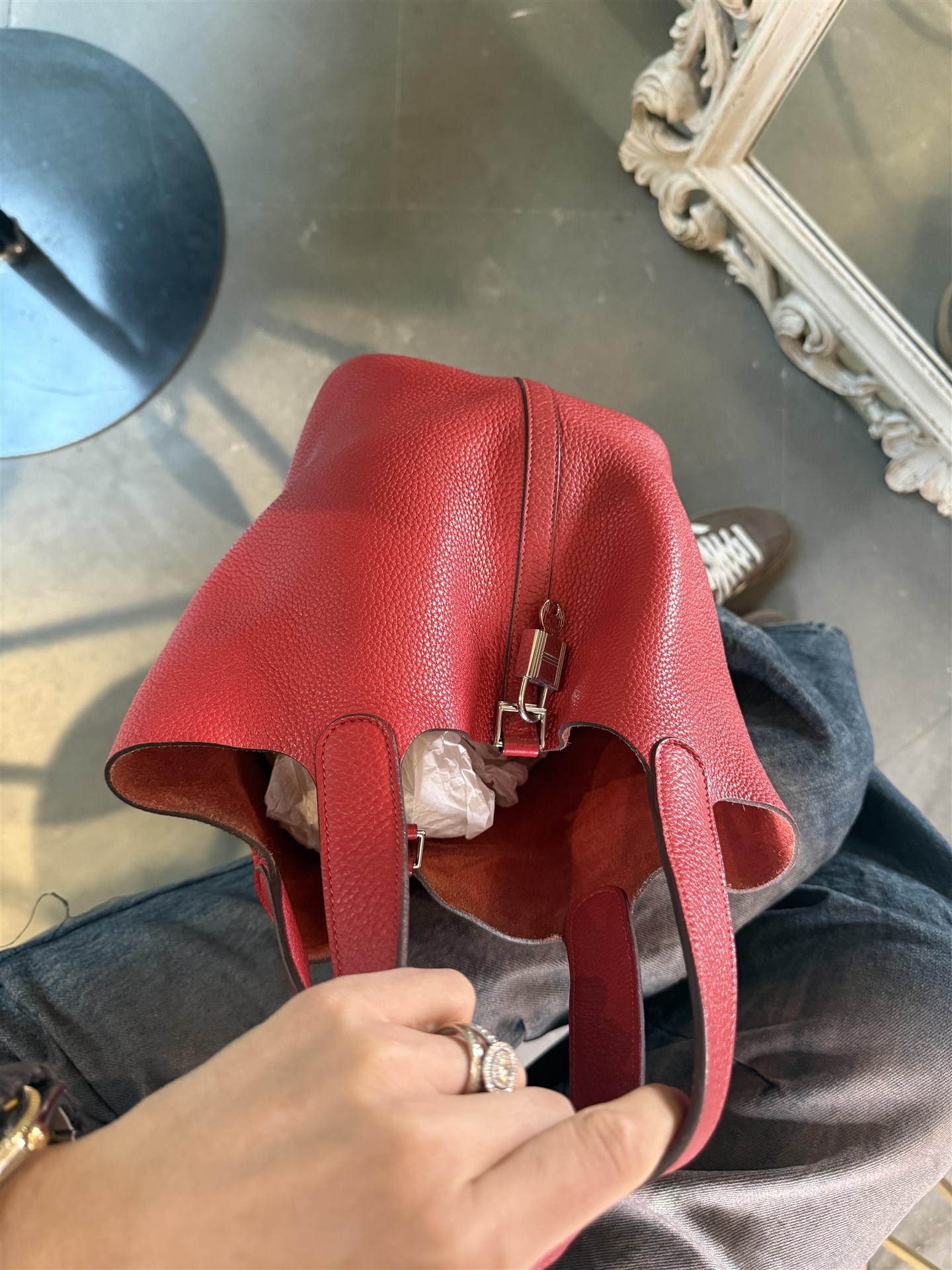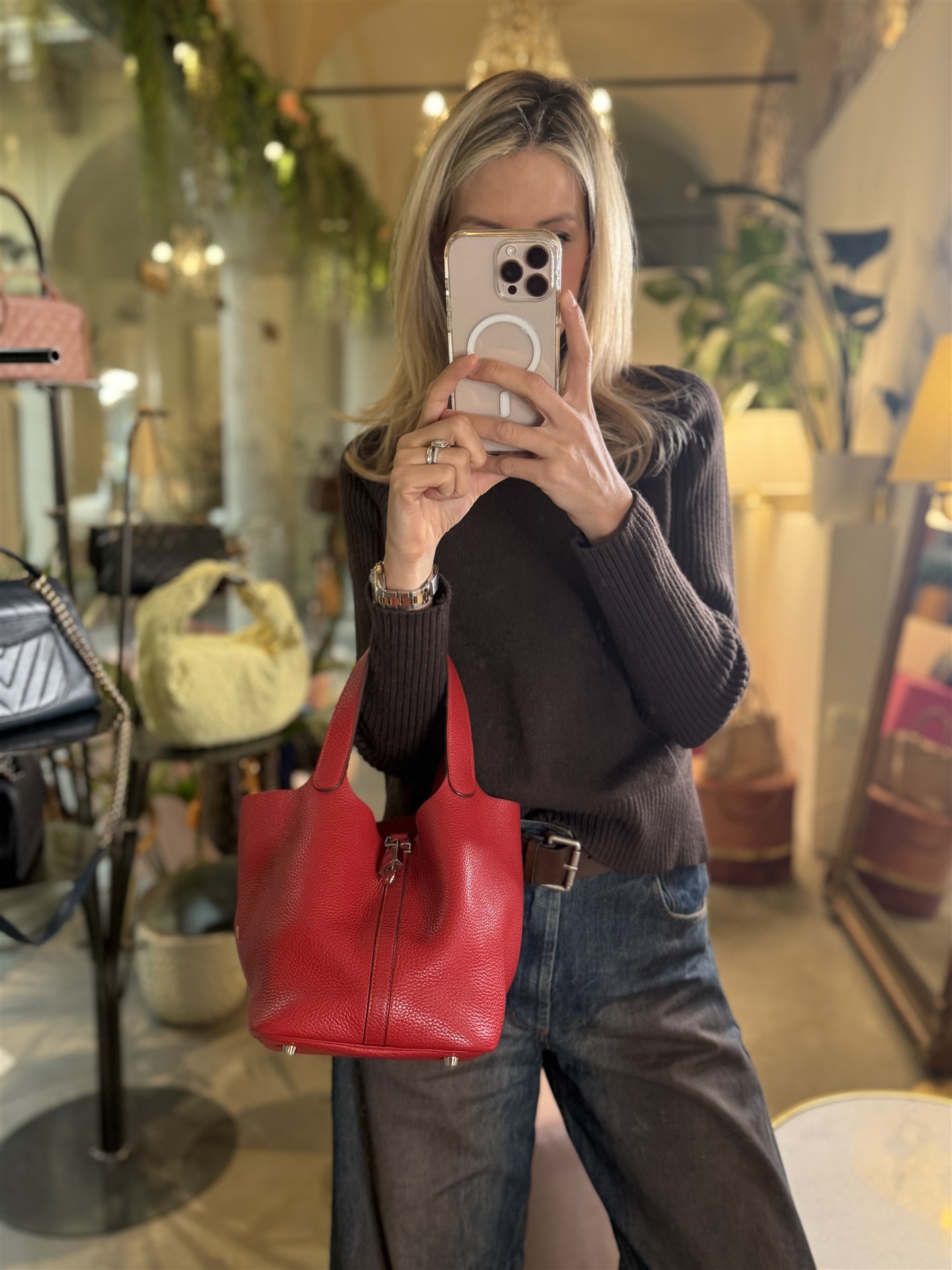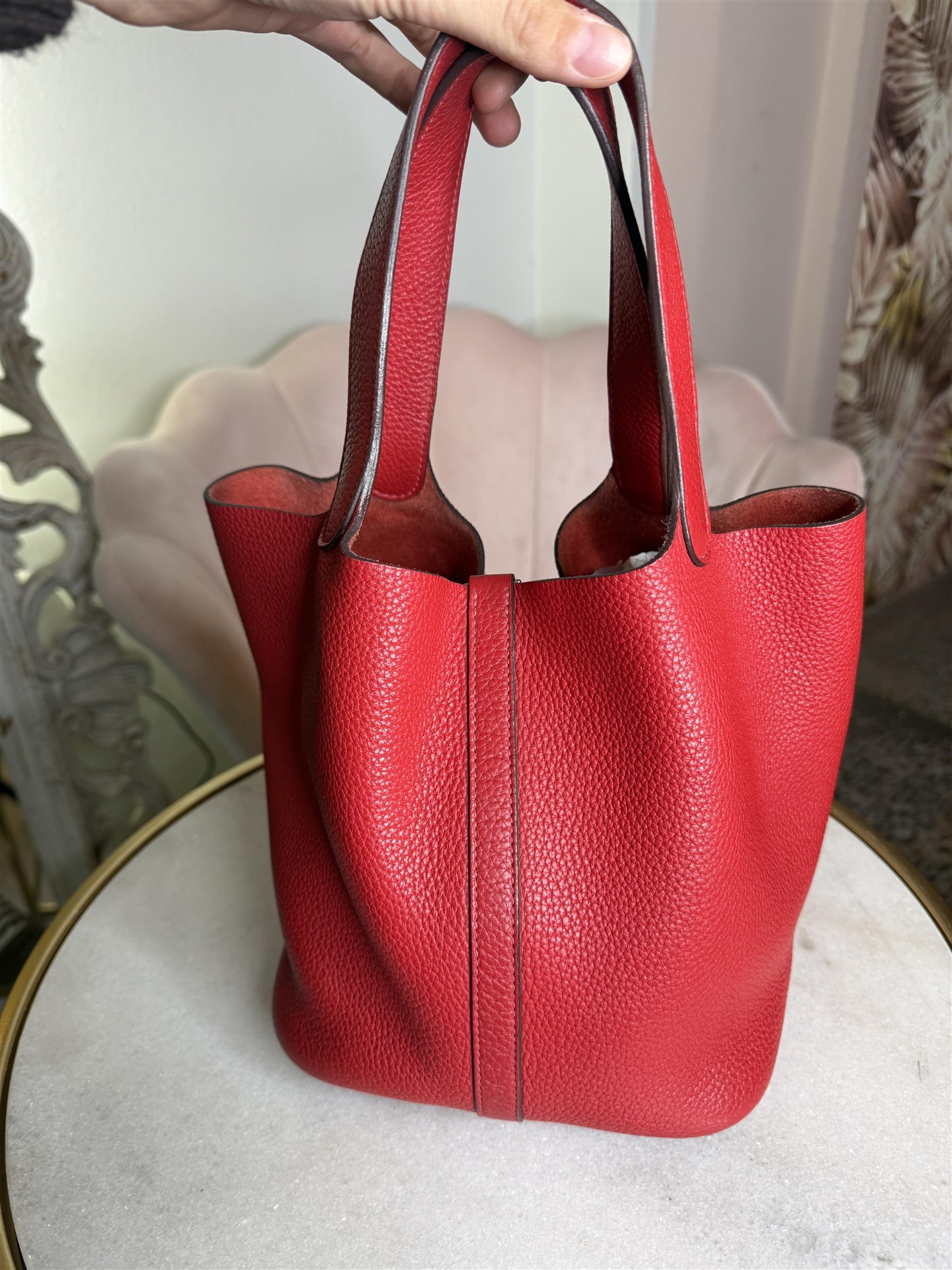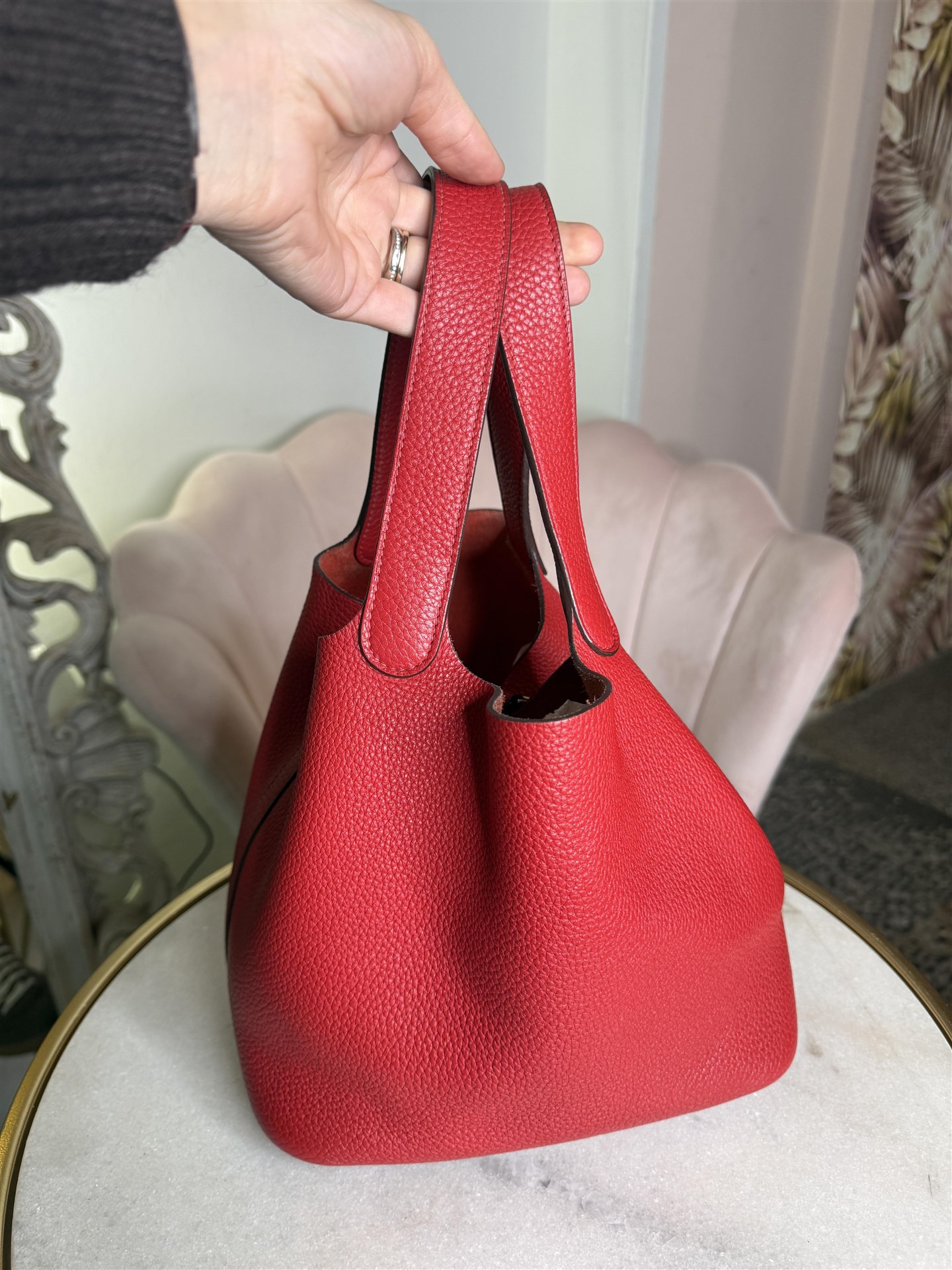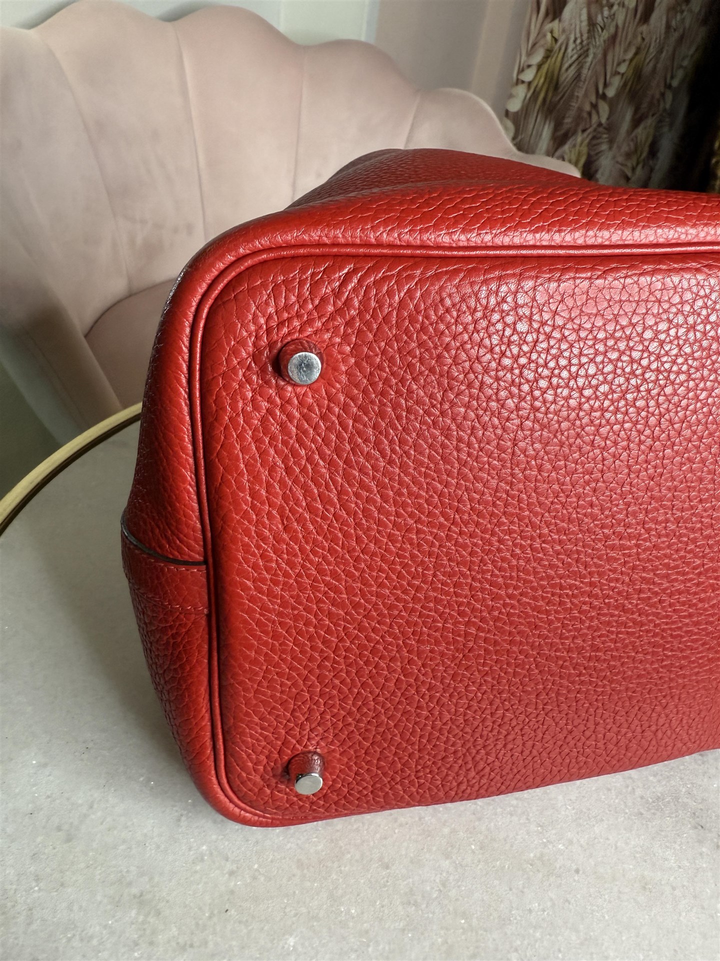 Hermès Picotin misura 22 cm in pelle Clemence color rosso con hardware palladio. Si presenta in ottime condizioni. Interno in suède tono su tono.